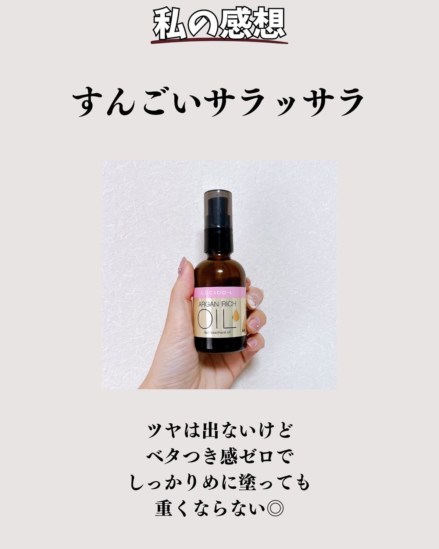 | 重ためなテクスチャーのヘアオイルだけど 仕上がりはまとまるのに軽やか。 | 詳細を見る | |||