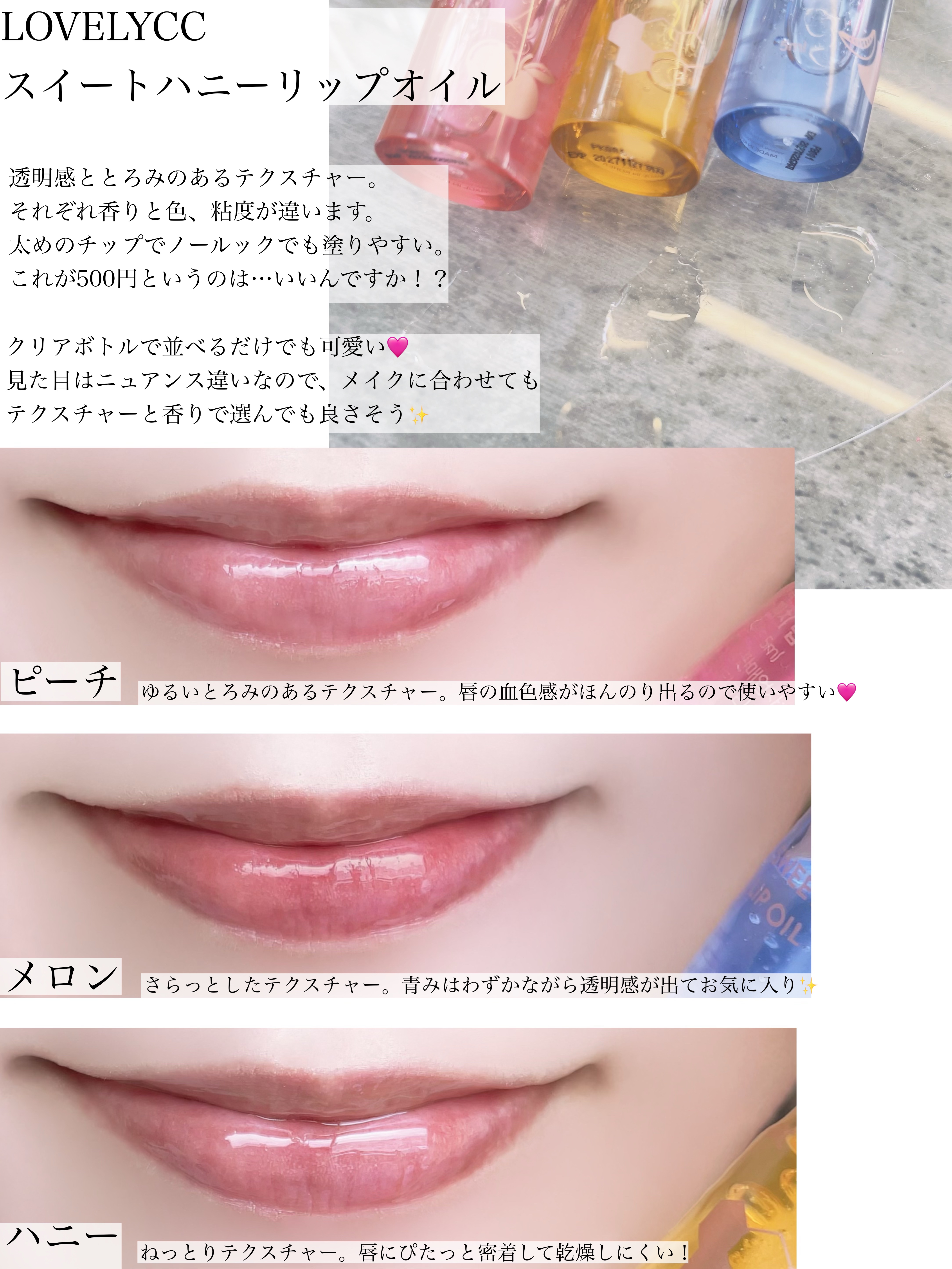 | 重すぎないほんのりとろっとしたテクスチャーのリップオイルです。 唇に乗せるとちゅるちゅるで可愛い! | 詳細を見る | ||