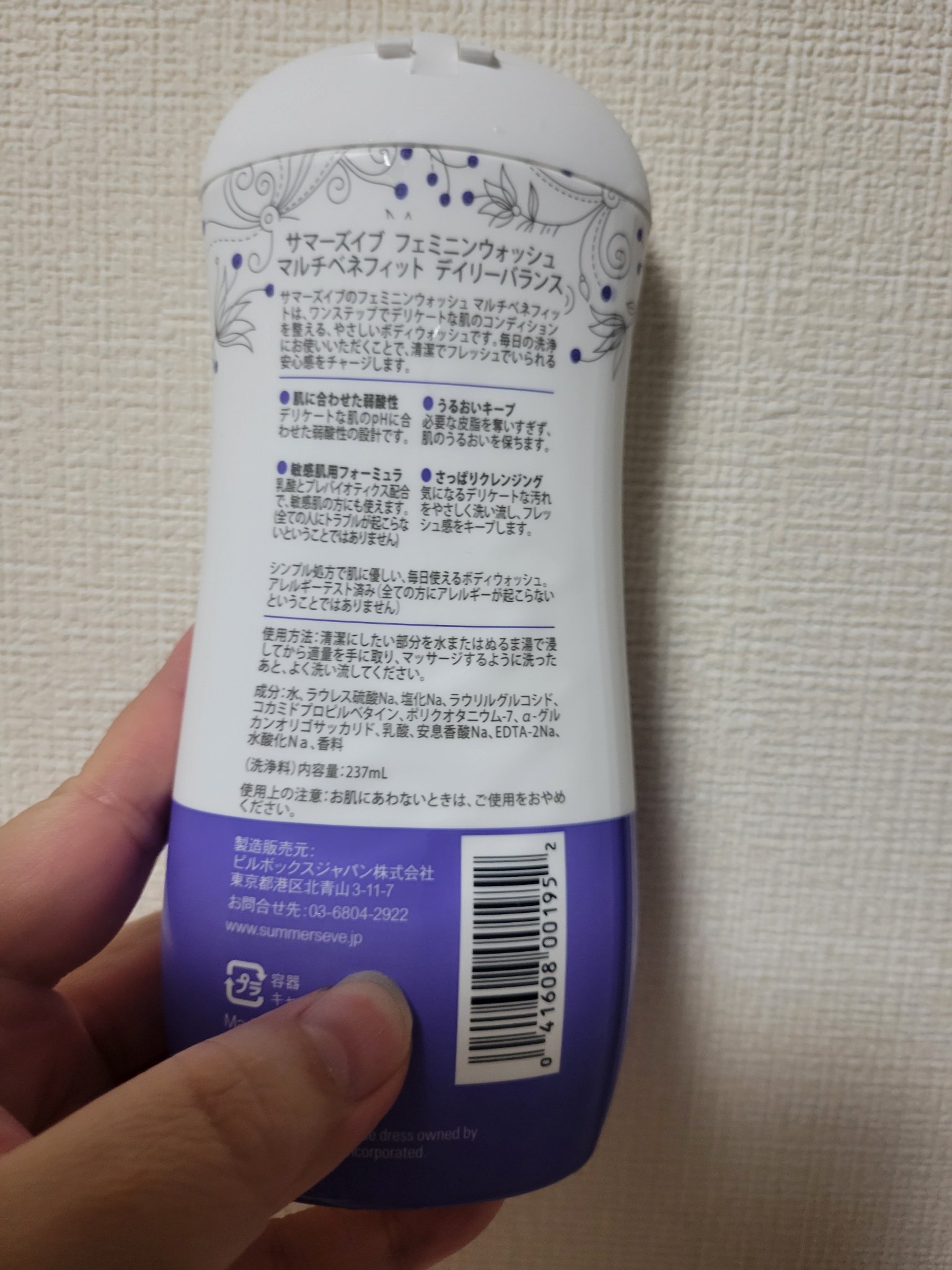 - 肌に優しい使い心地のデリケートゾーン用ボディウォッシュです。デリケートな肌のphに合わせてつくられた弱酸性設計。潤いをキープしながら、気になるデリケートな汚れをさっぱりクレンジングします。 デリケートゾーンのニオイ*やムレ、カサツキなどに悩まれている方にもおすすめです。 *古い角質や汚れによる 【日米話題のデリケートゾーンケアブランド】 Summer’s Eve(サマーズイブ)は、アメリカで生まれたデリケートゾーンケアブランドです。1972年から、フェムテック分野のパイオニアとして、世界30カ国以上で販売しています。日本での販売は2013年から。アメリカ、日本の両国でデリケートゾーンケアの売上シェア1位*を獲得しています。 *IRI Market Advantageデータ 米国婦人衛生用品ブランド別金額シェア2020年12月調べ(12カ月計) *富士経済「美容家電・化粧雑貨マーケティングトレンドデータ2018」マーケットシェア、デリケートゾーン用洗浄・シート市場、金額ベース、2016年実績 【専門機関による各種テストを実施】 安全性使用テストを発売前にすべての製品で実施 ① パッチテスト*:専門機関監修のもと、一定期間使用し、肌にアレルギー症状が出ないかテスト済 ②エチケット効果テスト:サマーズイブを使用してエチケット対策の変化に関するテストを実施 *すべての方にアレルギーや刺激が起こらないわけではありません。
