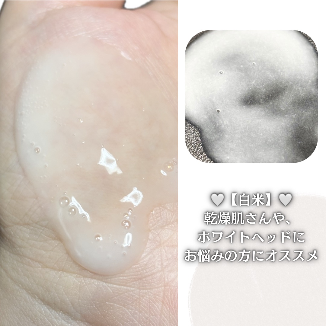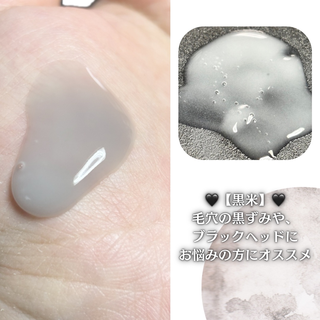 スーパー米”ペンタライス”配合 水分マグネットと呼ばれるペンタビチンとお米を合わせた次世代発酵成分 超とろみ系テクスチャーのピーリングアンプル。白米アンプルは半透明、黒米アンプルは黒ゴマのスイーツのような、黒色に甘酒を混ぜたような見た目。 洗い流した後はツルツルになりました。ピーリングジェルと違ってピーリングアンプルだからこそ、洗い流した後の突っ張りや乾燥がなくしっとりと仕上がります。