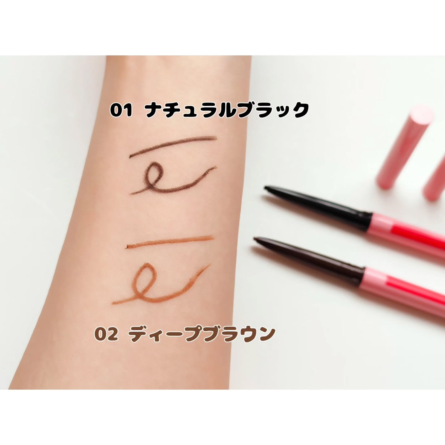 特徴はやはり筆💛 ほどよい硬さでとても描きやすかったです! 細いのにしっかりコシがあり、安定感があります😌 肌あたりもやさしく、スルスルとなめらかな描き心地が◎ 乾きも早くて使いやすい使用感でした🎵 Black(ブラック)のお色は発色が良くて、しっかり濃い綺麗なカラーで印象的な目元を演出してくれます✨ 環境に配慮されているという箱のパケも花柄で可愛いですよ🍀