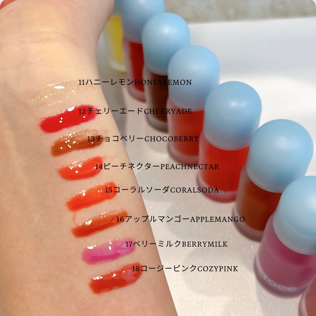 どの色味もとても艶が出て可愛くて、大好きです! ジューシーベリー プランピング リップオイル ★ 左から 11ハニーレモン 12チェリーエード 13チョコベリー 14ピーチネクター 15コーラルソーダ 16アップルマンゴー 17ベリーミルク 18コージーピンク ★