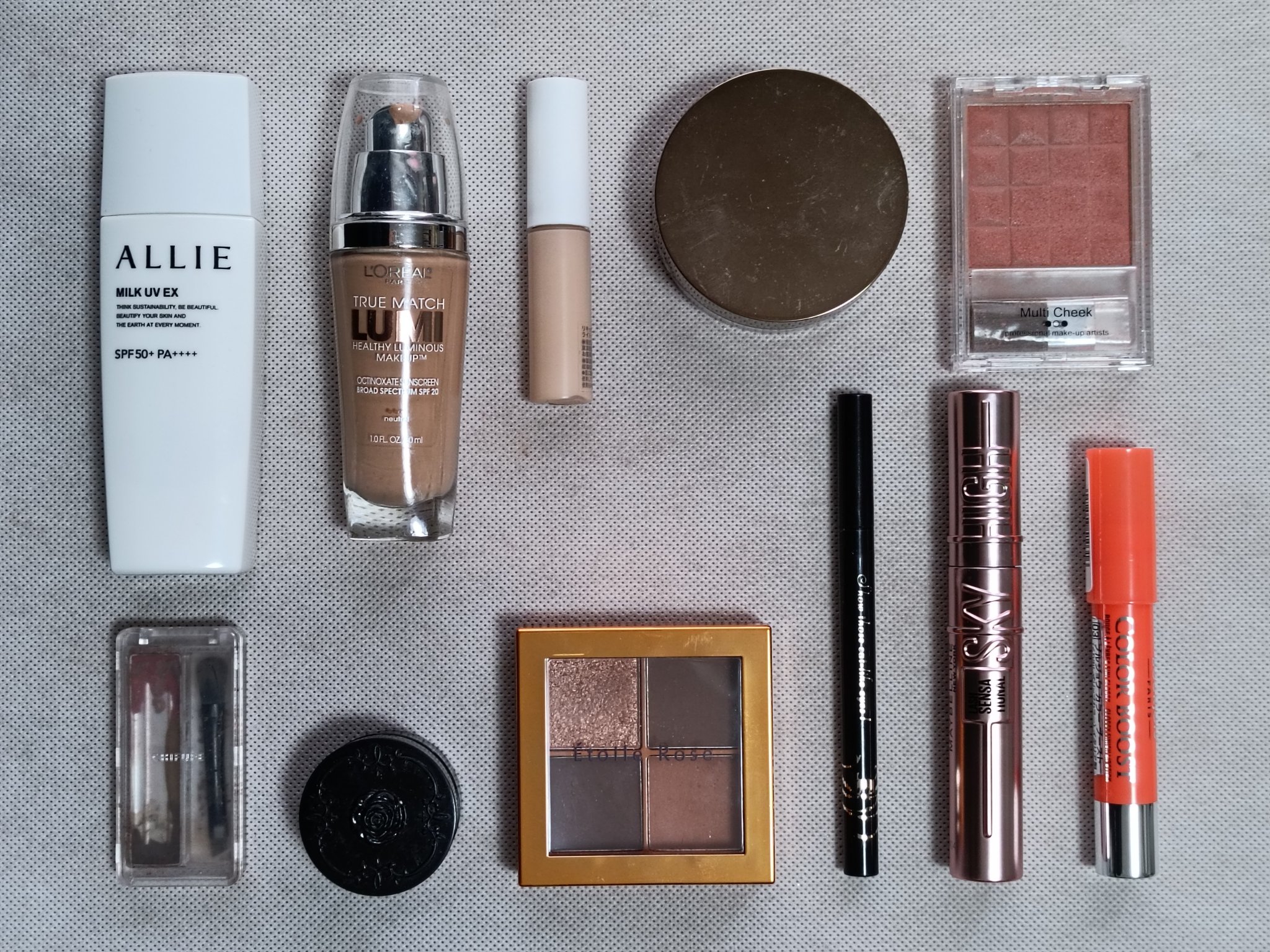 アリィー ニュアンスチェンジUV ジェル RSを、顔全体にまんべんなく塗ります。 RMK RMK ジェルクリーミィファンデーション 103を、顔全体にまんべんなく塗ります。 ジョンソンベビー ジョンソン ベビーパウダーを、顔全体にまんべんなく軽くはたきます。 THE BODY SHOP bronze shade warm glowを、両頬に塗ります。 KATE リフレクトミラーアイズ BR-1の締め色を、眉毛全体にまんべんなく塗ります。 URGLAM UR GLAMBLOOMING EYE COLOR PALETTE 01を、使用しました。 ちふれ リキッド アイライナー 筆ペンタイプ BK30 ブラックを、塗ります。 CEZANNE エアリーカールマスカラを、まつ毛全体にまんべんなく塗ります。 MAYBELLINE NEW YORK コロッサルボリュームエクスプレスを、まつ毛全体にまんべんなく塗ります。 MAYBELLINE NEW YORK SPステイ マットインク 135を、唇全体にまんべんなく塗ります。