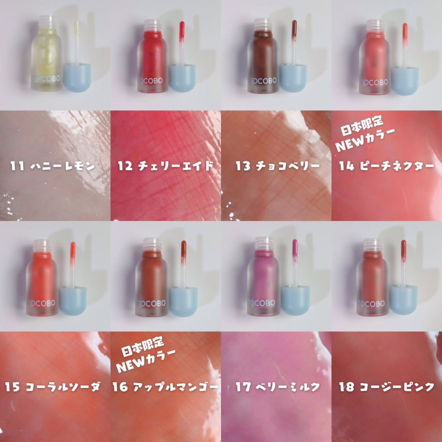 ジューシーベリープランピングリップオイル/8色頂きました🎁🤍 11番だけプランピング効果がありメイク効果によって縦じわを目立たなくしてくれます!初めてのプランパー使ったけどかなりボリュームでて驚き!😳 14.ピーチネクター🍑 16.アップルマンゴー🥭 こちらの2点は日本限定カラーです!