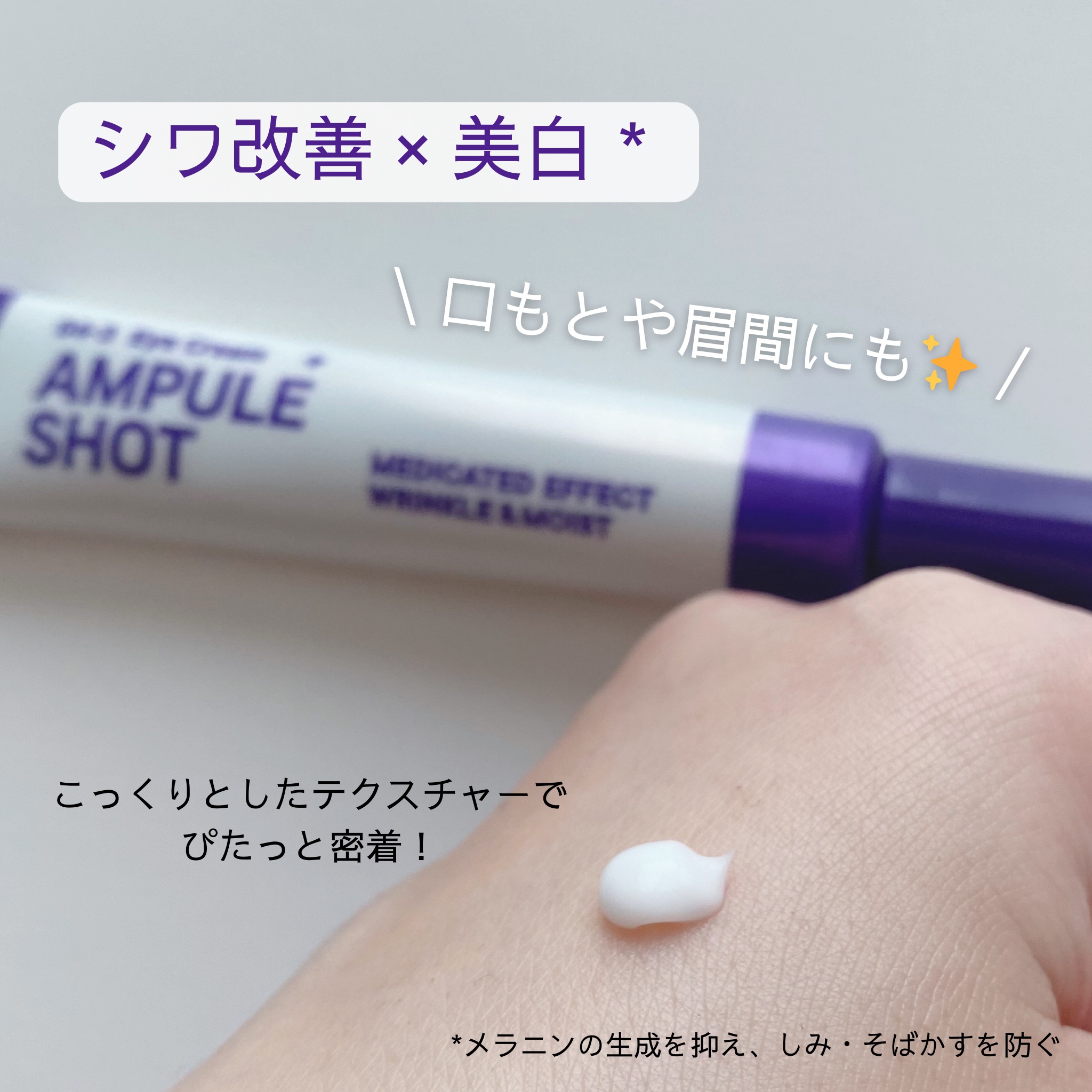 薬用アンプルショット薬用エフェクトリンクル&モイストアイクリーム薬用美白※1ハリ・弾力乾燥シミ予防※1シワ改善肌あれ、あれ性目もと、口もとに※1メラニンの生成を抑え、シミ、そばかすを防ぐこと。使ってみた感想です。出てくる口が細くなってて、目元...