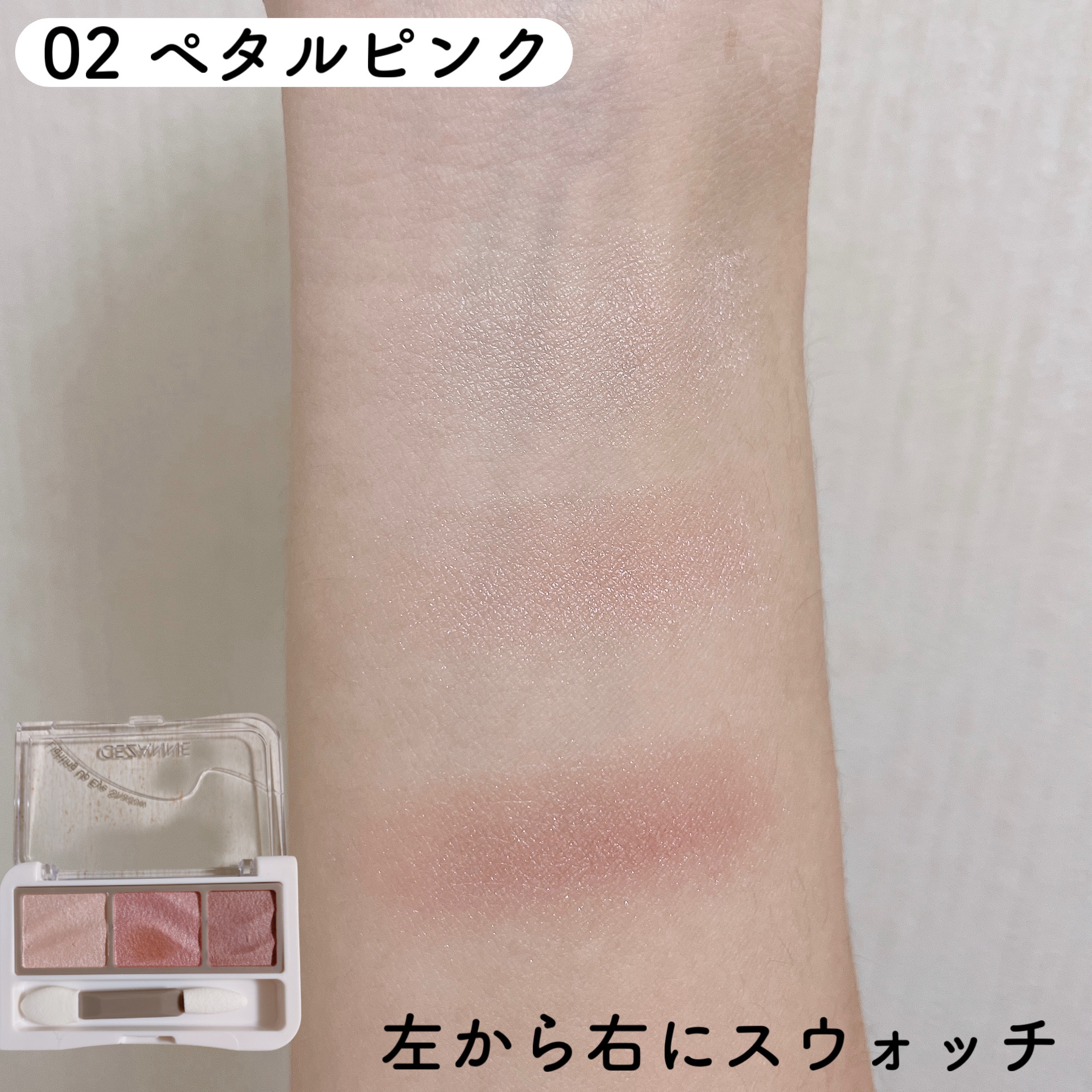 - 簡単に繊細グラデが作れる透けうる3色アイシャドウ。 使い方に迷わない!3色を重ねるだけで作りこんだような繊細グラデーションが完成。うるっと透け感×高発色で自然にくっきりとした目元に。 光を散乱させてくすみを払うソフトフォーカス効果パウダーを高配合。くすみにくく透き通るような明るい仕上がり。 しっとりとしたオイルコーティング処方で、ピタッと密着してヨレにくい。 ダブルエンドチップ付き。 01 ロイヤルベージュ:ベーシックに使いやすいブラウンベージュ。 02 ペタルピンク:ふんわり血色感をまとうライラックピンク。 03 シェルグレージュ:清楚な透明感のピンクグレージュ。