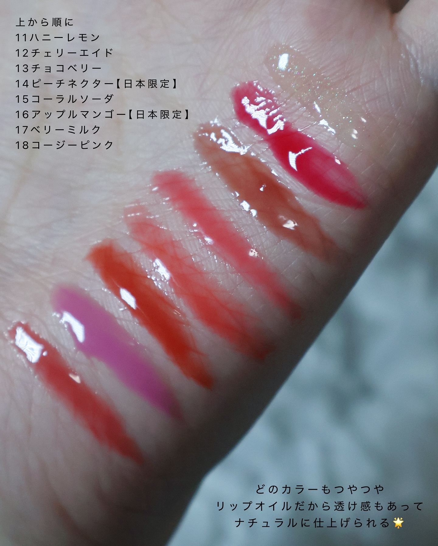 ジューシーベリープランピングリップオイル/8色頂きました🎁🤍 11番だけプランピング効果がありメイク効果によって縦じわを目立たなくしてくれます!初めてのプランパー使ったけどかなりボリュームでて驚き!😳 14.ピーチネクター🍑 16.アップルマンゴー🥭 こちらの2点は日本限定カラーです!