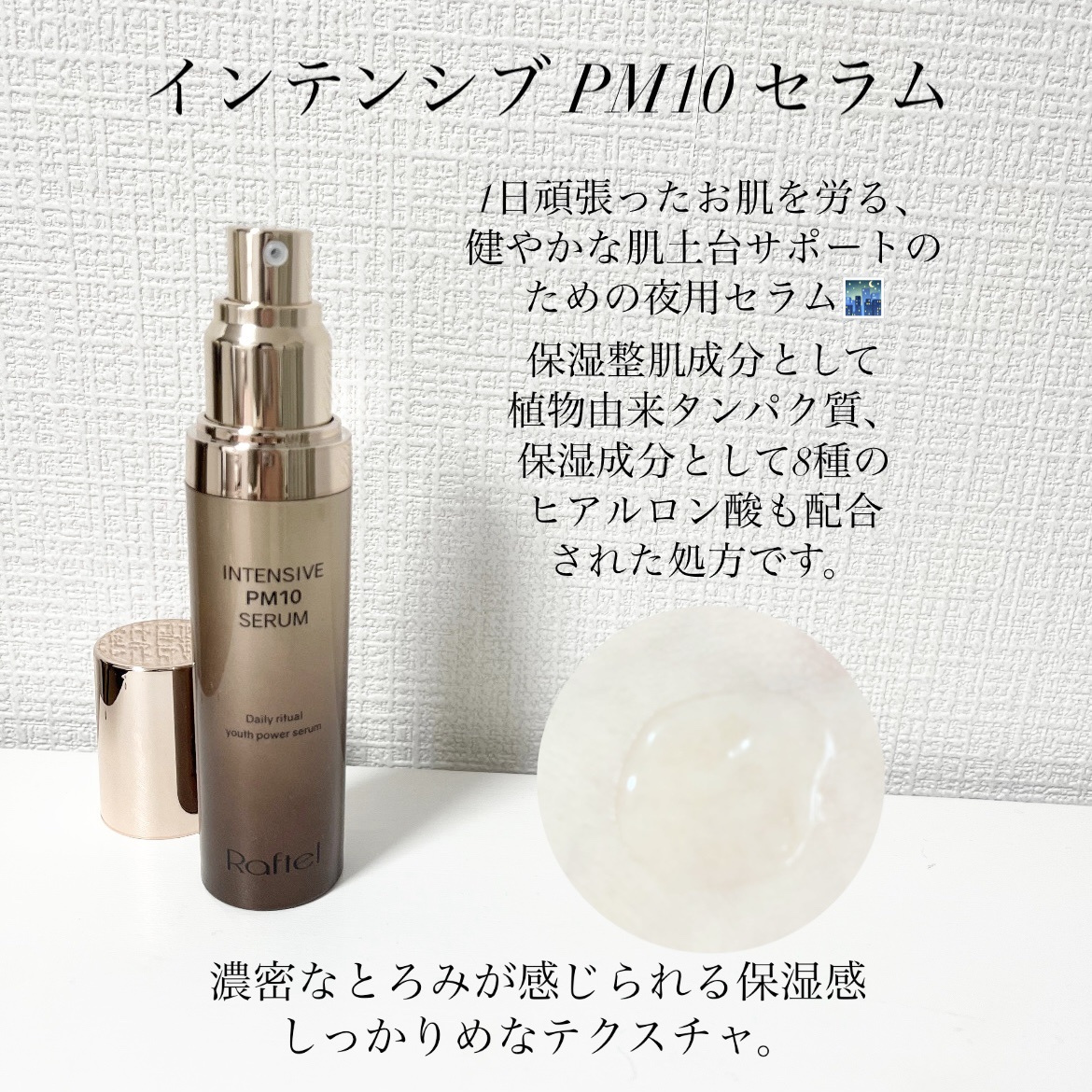 植物性リポソームで刺激を抑えた処方の整肌成分レチノールが3%配合されており、いわゆるA反応を起こしにくくしつつ肌のターンオーバーを促進します。 保湿成分であるフィラシード™️にセラミドNP、ヒアルロン酸まで豪華に配合されたアイテムです🥰 塗ったそばから潤いやもちっと感のある肌になれますので、日々ダメージを受けて肌バリアが弱くなっている・最近肌が荒れやすいという方におすすめです✌️