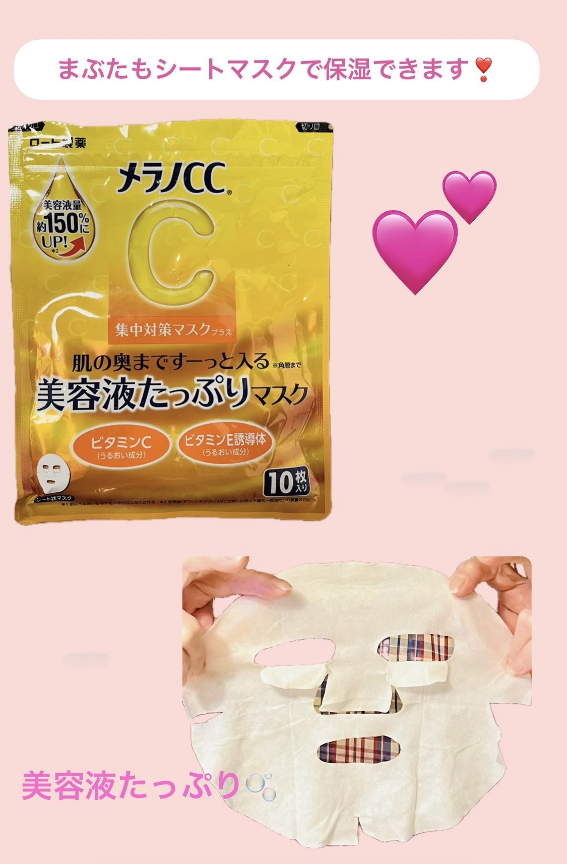 ロート製薬様から頂きました♪メラノCCメラノCC集中対策マスクプラスビタミンC※1※2、ビタミンE誘導体※1※3配合の分厚い密着マスク。※1:うるおい成分※2:アスコルビン酸※3:酢酸トコフェロール厚みのあるしっかりとしたシート!サイズ感はち...