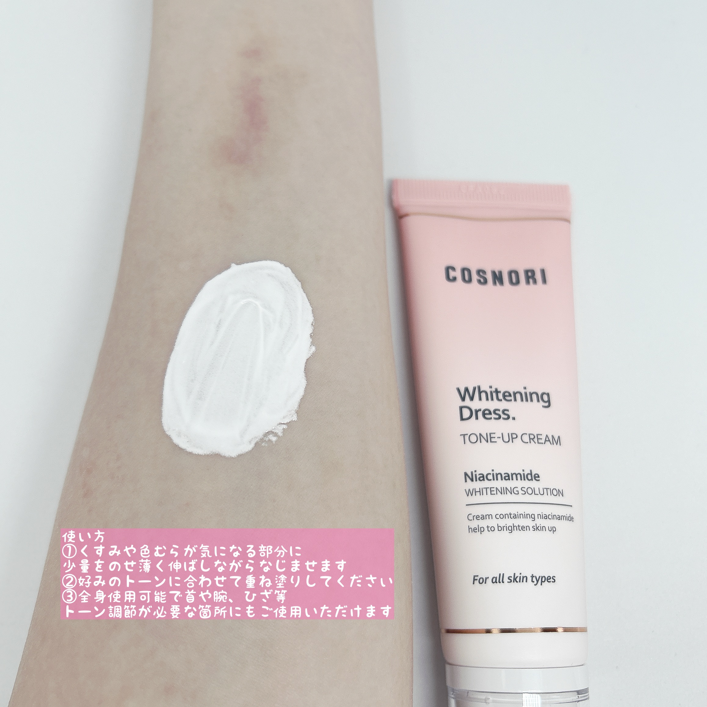 元から色白肌のようにナチュラルにトーンアップしてくれてお顔にも全身にも使用できる万能クリーム◎ 伸びも良くお肌にスッと馴染んでくれて密着力も高いのでお洋服が汚れにくいのも嬉しいポイント✊🏻✨ #COSNORI #コスノリ #Qoo10 #ホワイトニングドレストーンアップクリーム #トーンアップ下地 #トーンアップ #ノーファンデ