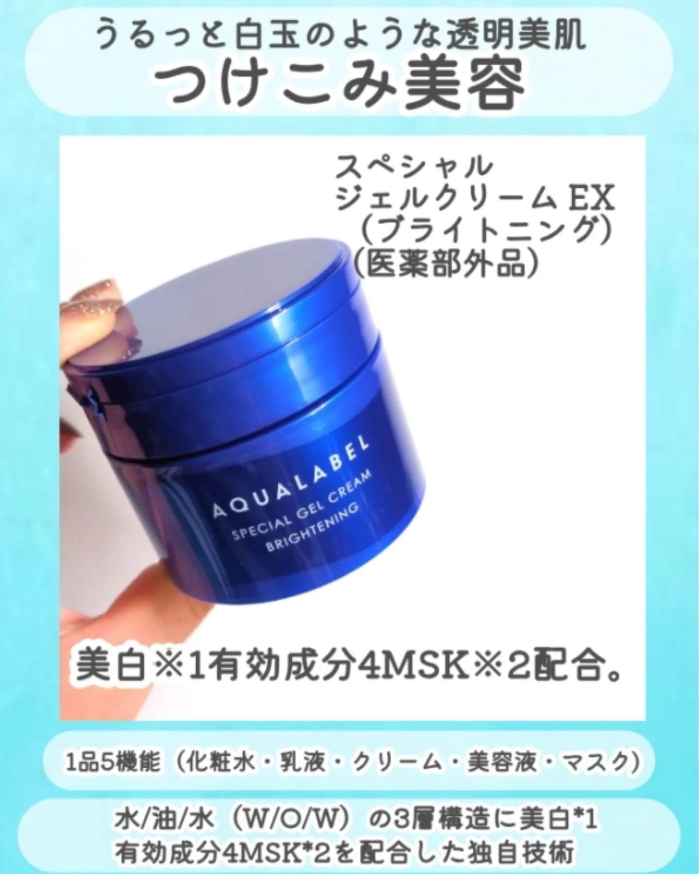 資生堂独自の美白有効成分「4MSK」を配合 デパコスに配合されている成分だよ! 3層構造ジェルクリーム 一般的な2層(油・水)ではなく、水・油・水の3層構造で、有効成分を過不足なく肌に届ける 洗顔のあとオールインワンを使うだけで、ご褒美エステ気分のケアが完了しちゃう贅沢アイテムでした💕