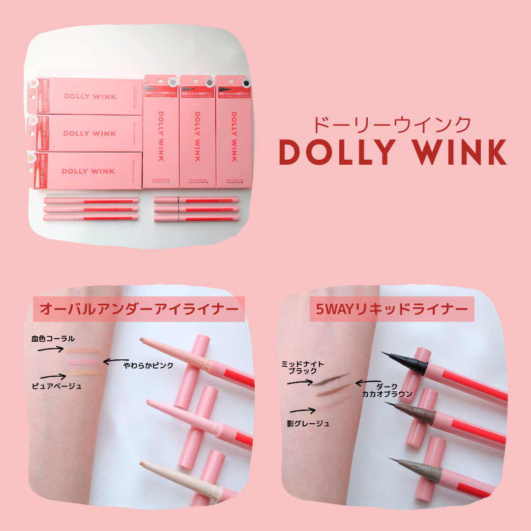 ドーリーウインク5WAYリキッドライナー&ドーリーウインクオーバルアンダーアイライナー○ドーリーウインク5WAYリキッドライナー可愛いらしいピンク色のパッケージ。カラーは01ミッドナイトブラック02ダークカカオブラウン03影グレージュ程よくコ...