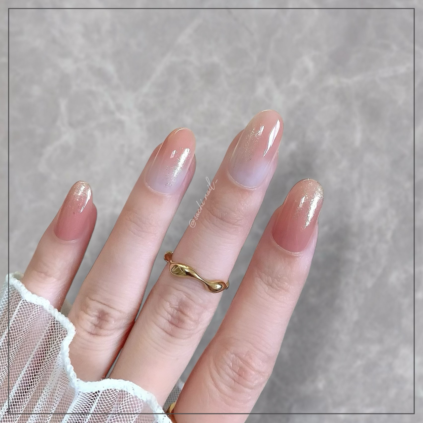 ワンカラーでも指ごとに色を変えるだけでオシャレに見えます💕 画像のようにゴールドラインとストーンを少し足すだけで華やかさがアップ🥰 何度かご紹介したことのあるスポンジで作るグラデーションです✨ スポンジを使うことで境目が綺麗に馴染んでくれます💕 アルミホイルの上でブラウンとトップコートを1:1くらいで混ぜたものを、トップコートのハケに取って3箇所に塗るだけ👌 事前に混ぜたものを塗ることで、爪の上でぼかすより簡単に出来ます💕 ベースカラーが乾く前に点置きしてぼかすことで綺麗にぼかせます✨ スピードが大事なので、使うポリッシュのキャップは全て開けておきましょう😊 天然石のラインはガタガタの方がより天然石っぽく見えるので、ラインを描くのが苦手な方でも大丈夫🙆♀️ 難しそうに見えて、やってみると意外と簡単に出来ます♡