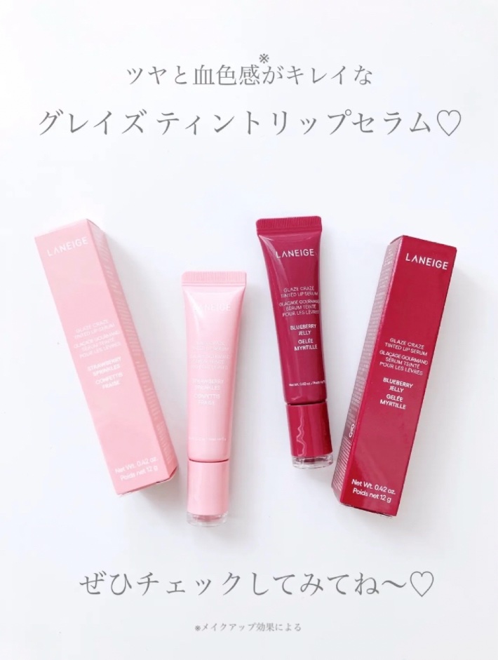 ■LANEIGEグレイズティントリップセラム・ストロベリースプリンクル🍓・ブルーベリージェリー🫐95%スキンケア成分配合の血色感*リップセラム💕ムラなくフィットするドーナツ型アプリケーターが塗りやすい!べたつかないツヤ仕上がりです✨*メイクア...