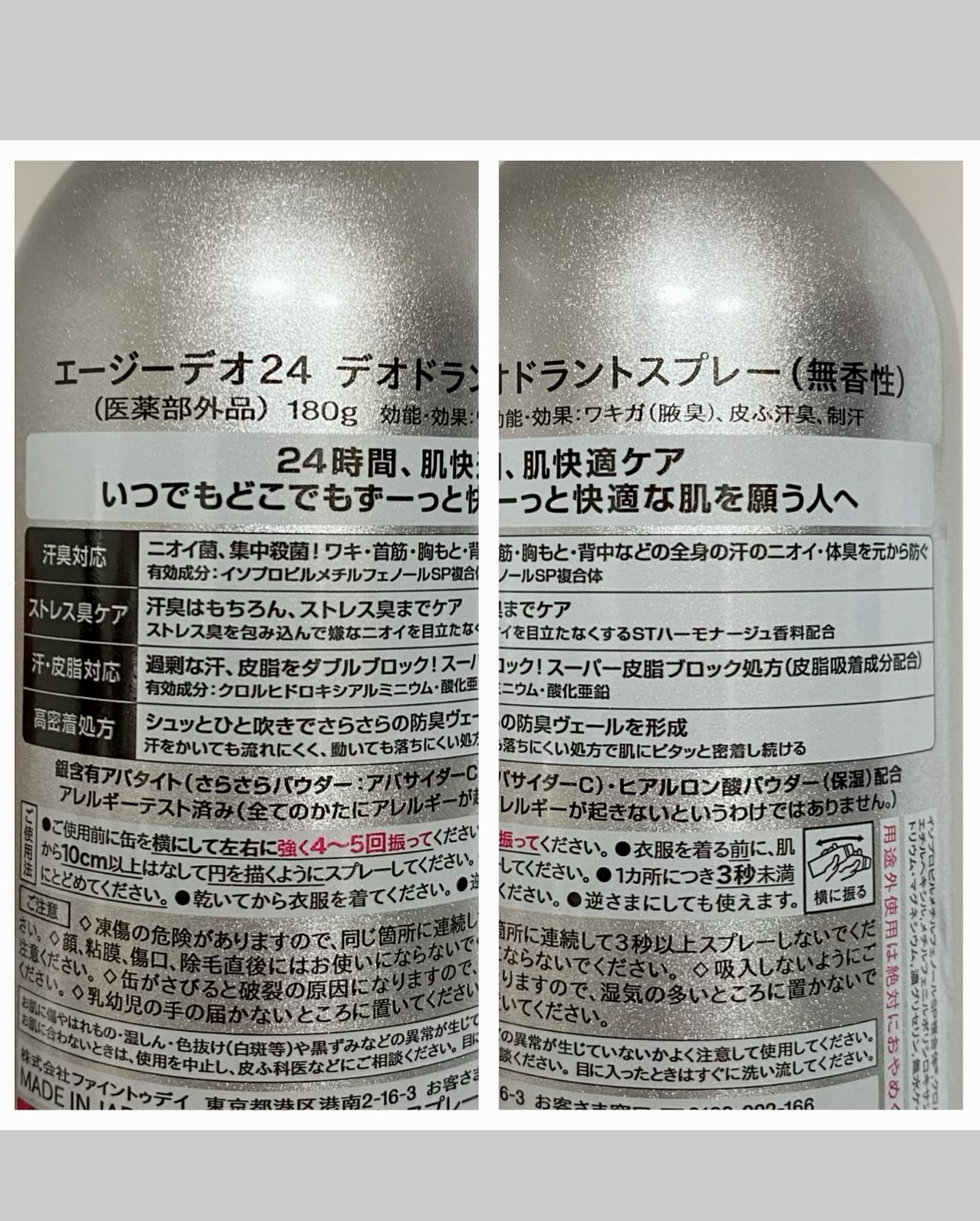 #PR#エージーデオエージーデオ24デオドラントスプレー(無香性)【医薬部外品】を使用しました。販売名:パウダースプレー fA(NF)容量/価格:180g/1,045円(税込)※価格は参考小売価格です(お店によって異なる場合があります)「エー...