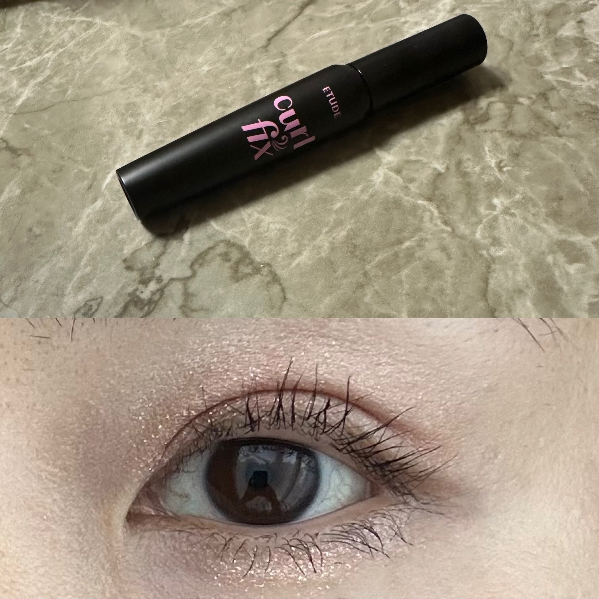 上向き束感まつ毛がつくれるカールフィックスマスカラにボリュームタイプ♬ 目のカーブに合う小さめブラシで細かい毛もキャッチして液づきもしっかり🙆♀️ 涙目になりやすいから、にじみにくいのって嬉しい🥰