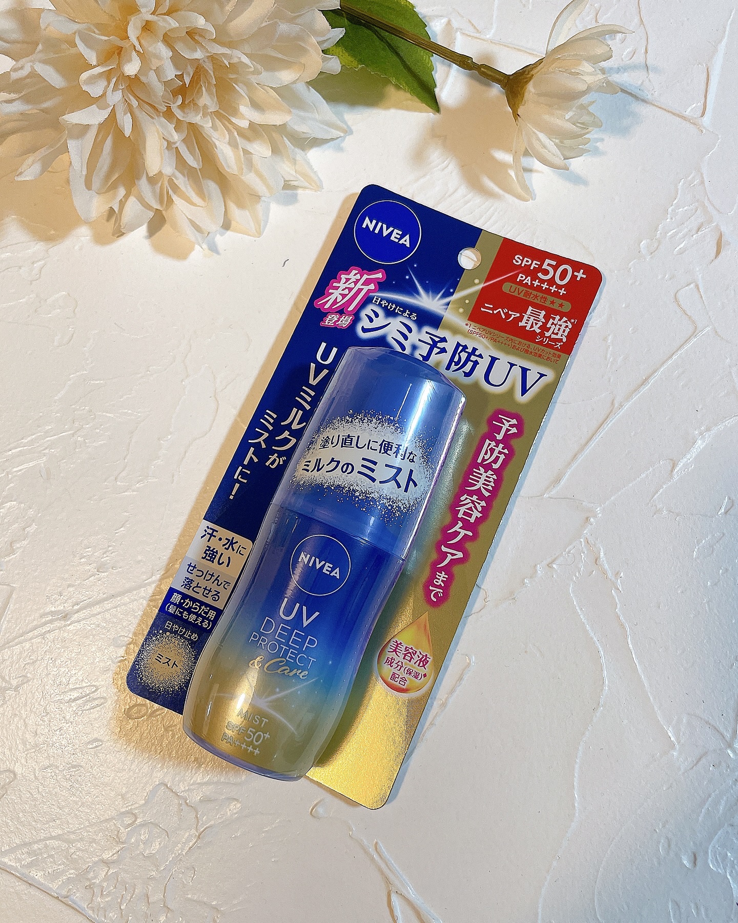 ニベアUVのディーププロテクト&ケアにミストタイプが新登場! 乳白色のUVミルクが瞬時にミスト化! 白のこりしないでピタッと密着するよ。ツヤをまとってうるおい感も◎ さわやかで透明感あるクリアフローラルの香りも良き!