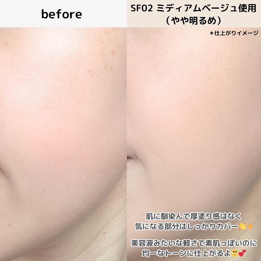 - <SF01 ライトベージュ(本体)> ジメチコン、水、酸化チタン、酸化亜鉛、BG、グリセリン、ジフェニルシロキシフェニルトリメチコン、ジカプリン酸ネオペンチルグリコール、メトキシケイヒ酸エチルヘキシル、PEG-10ジメチコン、キシリトール、イソステアリン酸、PEG-32、パルミチン酸アスコルビルリン酸3Na、ナイアシンアミド、グリシルグリシン、セラミドNG、セラミドNP、セラミドAP、セルロース、EDTA-2Na、キサンタンガム、クオタニウム-18ヘクトライト、ステアリン酸Mg、セスキイソステアリン酸ソルビタン、トリメチルシロキシケイ酸、ノイバラ果実エキス、ハイドロゲンジメチコン、フィトステロールズ、ラウロイルグルタミン酸Na、リシン、塩化Mg、水酸化Al、水添レシチン、硫酸Mg、フェノキシエタノール、マイカ、合成フルオロフロゴパイト、酸化鉄 <SF02 ミディアムベージュ(本体)> ジメチコン、水、酸化チタン、酸化亜鉛、BG、グリセリン、ジフェニルシロキシフェニルトリメチコン、ジカプリン酸ネオペンチルグリコール、メトキシケイヒ酸エチルヘキシル、PEG-10ジメチコン、キシリトール、イソステアリン酸、PEG-32、パルミチン酸アスコルビルリン酸3Na、ナイアシンアミド、グリシルグリシン、セラミドNG、セラミドNP、セラミドAP、セルロース、EDTA-2Na、キサンタンガム、クオタニウム-18ヘクトライト、ステアリン酸Mg、セスキイソステアリン酸ソルビタン、トリメチルシロキシケイ酸、ノイバラ果実エキス、ハイドロゲンジメチコン、フィトステロールズ、ラウロイルグルタミン酸Na、リシン、塩化Mg、水酸化Al、水添レシチン、硫酸Mg、フェノキシエタノール、マイカ、合成フルオロフロゴパイト、酸化鉄 <SF03 ナチュラルベージュ(本体)> ジメチコン、水、酸化チタン、酸化亜鉛、BG、グリセリン、ジフェニルシロキシフェニルトリメチコン、ジカプリン酸ネオペンチルグリコール、メトキシケイヒ酸エチルヘキシル、PEG-10ジメチコン、キシリトール、イソステアリン酸、PEG-32、パルミチン酸アスコルビルリン酸3Na、ナイアシンアミド、グリシルグリシン、セラミドNG、セラミドNP、セラミドAP、セルロース、EDTA-2Na、キサンタンガム、クオタニウム-18ヘクトライト、ステアリン酸Mg、セスキイソステアリン酸ソルビタン、トリメチルシロキシケイ酸、ノイバラ果実エキス、ハイドロゲンジメチコン、フィトステロールズ、ラウロイルグルタミン酸Na、リシン、塩化Mg、水酸化Al、水添レシチン、硫酸Mg、フェノキシエタノール、マイカ、合成フルオロフロゴパイト、酸化鉄 <SF01 ライトベージュ(リフィル)> ジメチコン、水、酸化チタン、酸化亜鉛、BG、グリセリン、ジフェニルシロキシフェニルトリメチコン、ジカプリン酸ネオペンチルグリコール、メトキシケイヒ酸エチルヘキシル、PEG-10ジメチコン、キシリトール、イソステアリン酸、PEG-32、パルミチン酸アスコルビルリン酸3Na、ナイアシンアミド、グリシルグリシン、セラミドNG、セラミドNP、セラミドAP、セルロース、EDTA-2Na、キサンタンガム、クオタニウム-18ヘクトライト、ステアリン酸Mg、セスキイソステアリン酸ソルビタン、トリメチルシロキシケイ酸、ノイバラ果実エキス、ハイドロゲンジメチコン、フィトステロールズ、ラウロイルグルタミン酸Na、リシン、塩化Mg、水酸化Al、水添レシチン、硫酸Mg、フェノキシエタノール、マイカ、合成フルオロフロゴパイト、酸化鉄 <SF02 ミディアムベージュ(リフィル)> ジメチコン、水、酸化チタン、酸化亜鉛、BG、グリセリン、ジフェニルシロキシフェニルトリメチコン、ジカプリン酸ネオペンチルグリコール、メトキシケイヒ酸エチルヘキシル、PEG-10ジメチコン、キシリトール、イソステアリン酸、PEG-32、パルミチン酸アスコルビルリン酸3Na、ナイアシンアミド、グリシルグリシン、セラミドNG、セラミドNP、セラミドAP、セルロース、EDTA-2Na、キサンタンガム、クオタニウム-18ヘクトライト、ステアリン酸Mg、セスキイソステアリン酸ソルビタン、トリメチルシロキシケイ酸、ノイバラ果実エキス、ハイドロゲンジメチコン、フィトステロールズ、ラウロイルグルタミン酸Na、リシン、塩化Mg、水酸化Al、水添レシチン、硫酸Mg、フェノキシエタノール、マイカ、合成フルオロフロゴパイト、酸化鉄 <SF03 ナチュラルベージュ(リフィル )> ジメチコン、水、酸化チタン、酸化亜鉛、BG、グリセリン、ジフェニルシロキシフェニルトリメチコン、ジカプリン酸ネオペンチルグリコール、メトキシケイヒ酸エチルヘキシル、PEG-10ジメチコン、キシリトール、イソステアリン酸、PEG-32、パルミチン酸アスコルビルリン酸3Na、ナイアシンアミド、グリシルグリシン、セラミドNG、セラミドNP、セラミドAP、セルロース、EDTA-2Na、キサンタンガム、クオタニウム-18ヘクトライト、ステアリン酸Mg、セスキイソステアリン酸ソルビタン、トリメチルシロキシケイ酸、ノイバラ果実エキス、ハイドロゲンジメチコン、フィトステロールズ、ラウロイルグルタミン