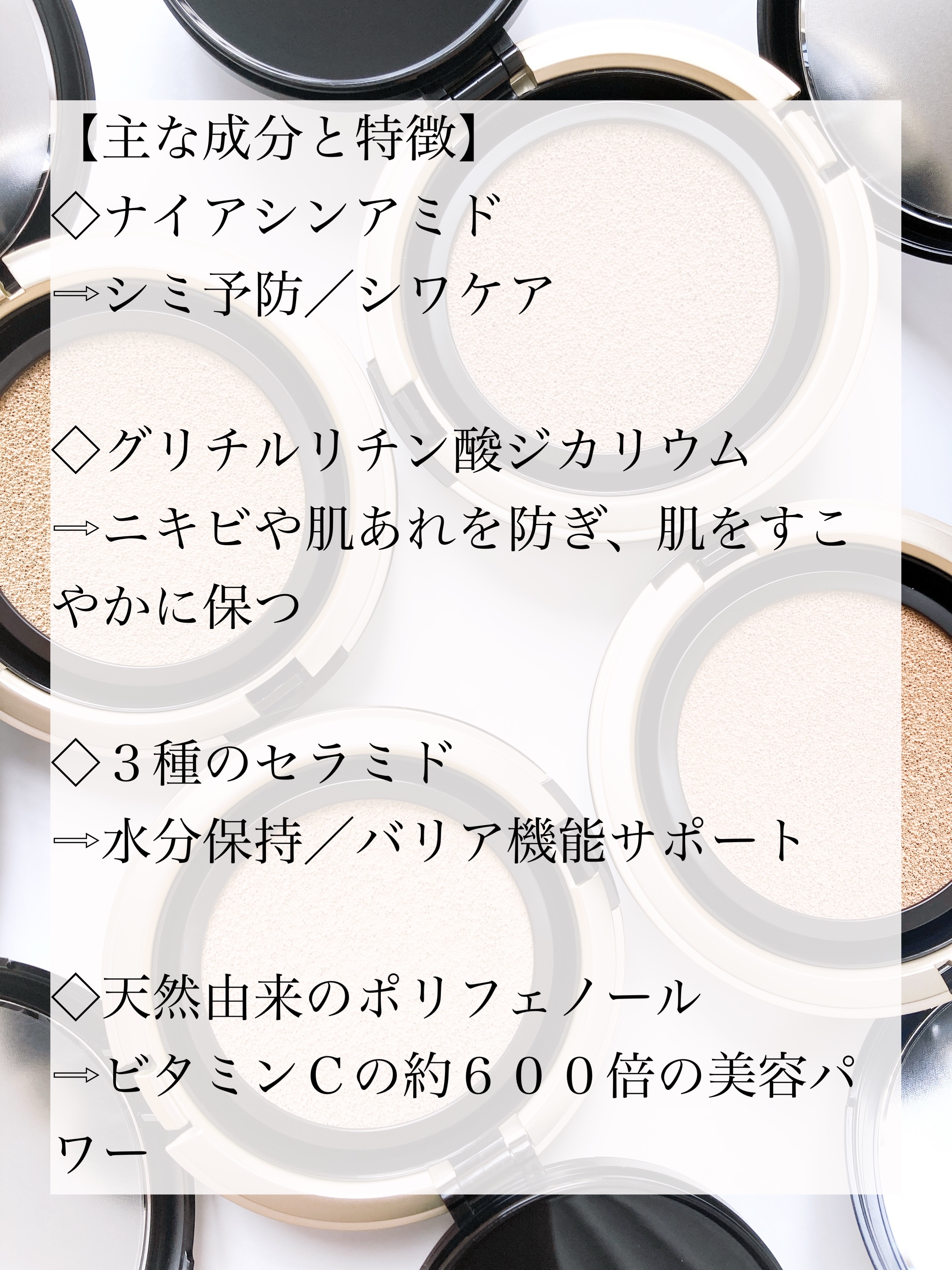 - <ベージュ(Holiday Limited Edition)> ナイアシンアミド、グリチルリチン酸ジカリウム、フランスカイガンショウ樹皮エキス、ヒアルロン酸ナトリウム(2)、水溶性コラーゲン液、ローズマリーエキス、加水分解ローヤルゼリータンパク液、アルテロモナス発酵エキス、キウイエキス、酵母エキス(3)、テトラ2-へキシルデカン酸アスコルビル、L-アスコルビン酸 2-グルコシド、3-O-エチルアスコルビン酸、加水分解シルク液、N-ステアロイルジヒドロスフィンゴシン、N-ステアロイルフィトスフィンゴシン、ヒドロキシステアリルフィトスフィンゴシン、コメヌカスフィンゴ糖脂質、グリシン、L-アラニン、L-セリン、L-バリン、L-イソロイシン、L-スレオニン、L-プロリン、L-フェニルアラニン、L-ヒスチジン、L-アルギニン、L-アスパラギン酸、L-ピロリドンカルボン酸、シア脂、DL-ピロリドンカルボン酸ナトリウム液、精製水、濃グリセリン、ジプロピレングリコール、1,3-ブチレングリコール、グリセリン脂肪酸エステル、2-オクチルドデカノール、グリセリンモノ2-エチルヘキシルエーテル、トリ2-エチルヘキサン酸グリセリル、テトラ2-エチルヘキサン酸ペンタエリトリット、デカメチルシクロペンタシロキサン、架橋型メチルポリシロキサン、メチルフェニルポリシロキサン、リンゴ酸ジイソステアリル、ジリノール酸ジ(フィトステリル/イソステアリル/セチル/ステアリル/ベヘニル)、酸化アルミニウム、水酸化アルミニウム、イソステアリン酸、ステアリン酸、微粒子酸化チタン、雲母チタン、ポリアクリル酸アルキル、硫酸バリウム、ヘキサメチレンジイソシアネート/トリメチロールヘキシルラクトン架橋ポリマー、タルク、酸化チタン、n-オクチルシリル化酸化チタン、n-オクチルシリル化黄酸化鉄、n-オクチルシリル化ベンガラ、n-オクチルシリル化黒酸化鉄、乳酸ナトリウム液、水酸化ナトリウム、無水ケイ酸、硫酸マグネシウム、トリメチルシロキシケイ酸、PEG-9ポリジメチルシロキシエチルジメチコン、ポリオキシエチレン・メチルポリシロキサン共重合体、ポリ(オキシエチレン・オキシプロピレン)メチルポリシロキサン共重合体、フェノキシエタノール <オークル(Holiday Limited Edition)> ナイアシンアミド、グリチルリチン酸ジカリウム、フランスカイガンショウ樹皮エキス、ヒアルロン酸ナトリウム(2)、水溶性コラーゲン液、ローズマリーエキス、加水分解ローヤルゼリータンパク液、アルテロモナス発酵エキス、キウイエキス、酵母エキス(3)、テトラ2-へキシルデカン酸アスコルビル、L-アスコルビン酸 2-グルコシド、3-O-エチルアスコルビン酸、加水分解シルク液、N-ステアロイルジヒドロスフィンゴシン、N-ステアロイルフィトスフィンゴシン、ヒドロキシステアリルフィトスフィンゴシン、コメヌカスフィンゴ糖脂質、グリシン、L-アラニン、L-セリン、L-バリン、L-イソロイシン、L-スレオニン、L-プロリン、L-フェニルアラニン、L-ヒスチジン、L-アルギニン、L-アスパラギン酸、L-ピロリドンカルボン酸、シア脂、DL-ピロリドンカルボン酸ナトリウム液、精製水、濃グリセリン、ジプロピレングリコール、1,3-ブチレングリコール、グリセリン脂肪酸エステル、2-オクチルドデカノール、グリセリンモノ2-エチルヘキシルエーテル、トリ2-エチルヘキサン酸グリセリル、テトラ2-エチルヘキサン酸ペンタエリトリット、デカメチルシクロペンタシロキサン、架橋型メチルポリシロキサン、メチルフェニルポリシロキサン、リンゴ酸ジイソステアリル、ジリノール酸ジ(フィトステリル/イソステアリル/セチル/ステアリル/ベヘニル)、酸化アルミニウム、水酸化アルミニウム、イソステアリン酸、ステアリン酸、微粒子酸化チタン、雲母チタン、ポリアクリル酸アルキル、硫酸バリウム、ヘキサメチレンジイソシアネート/トリメチロールヘキシルラクトン架橋ポリマー、タルク、酸化チタン、n-オクチルシリル化酸化チタン、n-オクチルシリル化黄酸化鉄、n-オクチルシリル化ベンガラ、n-オクチルシリル化黒酸化鉄、乳酸ナトリウム液、水酸化ナトリウム、無水ケイ酸、硫酸マグネシウム、トリメチルシロキシケイ酸、PEG-9ポリジメチルシロキシエチルジメチコン、ポリオキシエチレン・メチルポリシロキサン共重合体、ポリ(オキシエチレン・オキシプロピレン)メチルポリシロキサン共重合体、フェノキシエタノール <ニュートラル(Holiday Limited Edition)> ナイアシンアミド、グリチルリチン酸ジカリウム、フランスカイガンショウ樹皮エキス、ヒアルロン酸ナトリウム(2)、水溶性コラーゲン液、ローズマリーエキス、加水分解ローヤルゼリータンパク液、アルテロモナス発酵エキス、キウイエキス、酵母エキス(3)、テトラ2-へキシルデカン酸アスコルビル、L-アスコルビン酸 2-グルコシド、3-O-エチルアスコルビン酸、加水分解シルク液、N-ステアロイルジヒドロスフィンゴシン、N-ステアロイルフィトスフィンゴシン、ヒドロキシステアリルフィトスフ