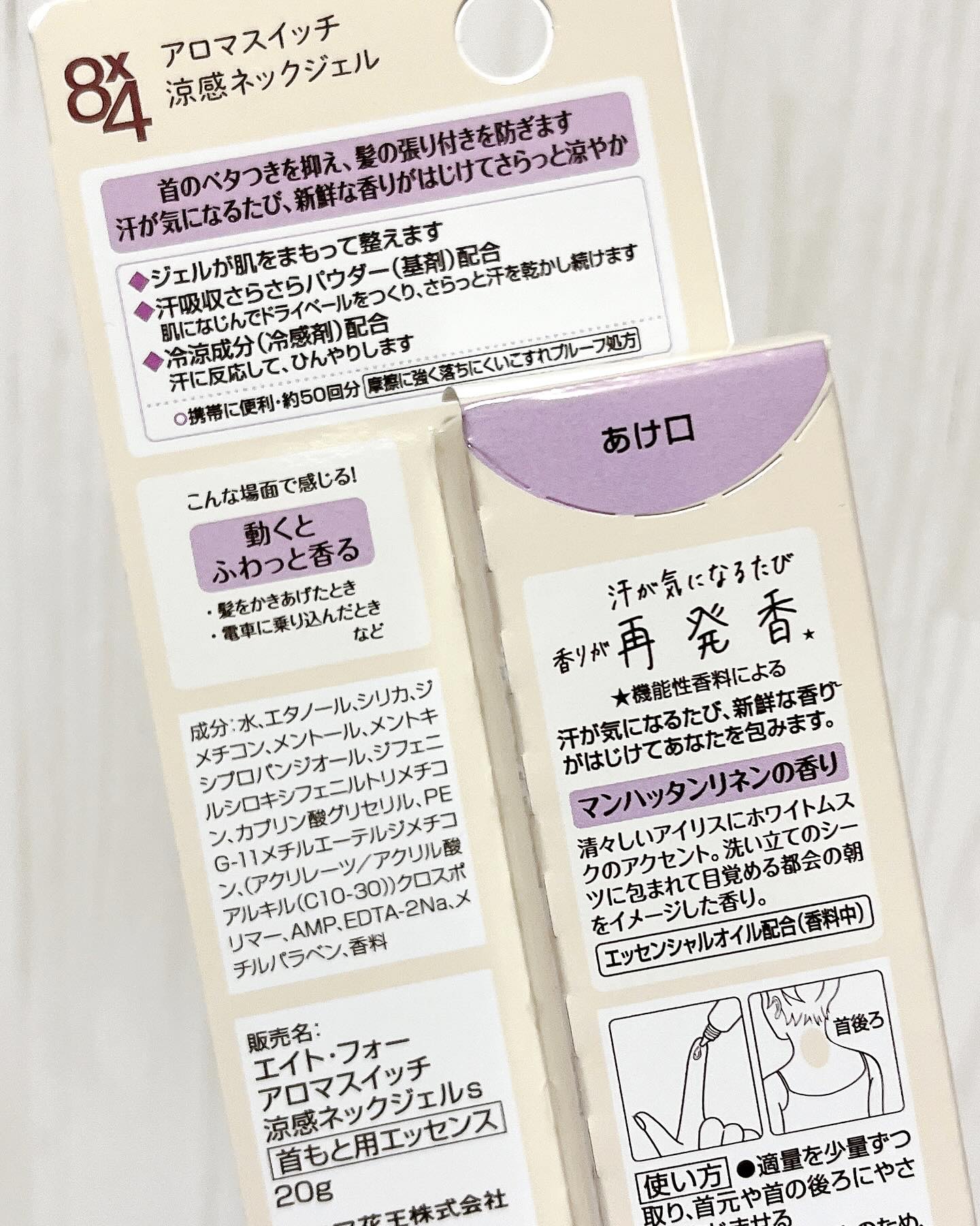 8x4アロマスイッチ涼感ネックジェルマンハッタンリネンの香り〜首のベタつきを抑え、髪の張り付きを防ぎます汗が気になるたび、新鮮な香りがはじけてさらっと涼やか〜マンハッタンリネン清々しいアイリスにホワイトムスクのアクセント洗い立てのシーツに包ま...
