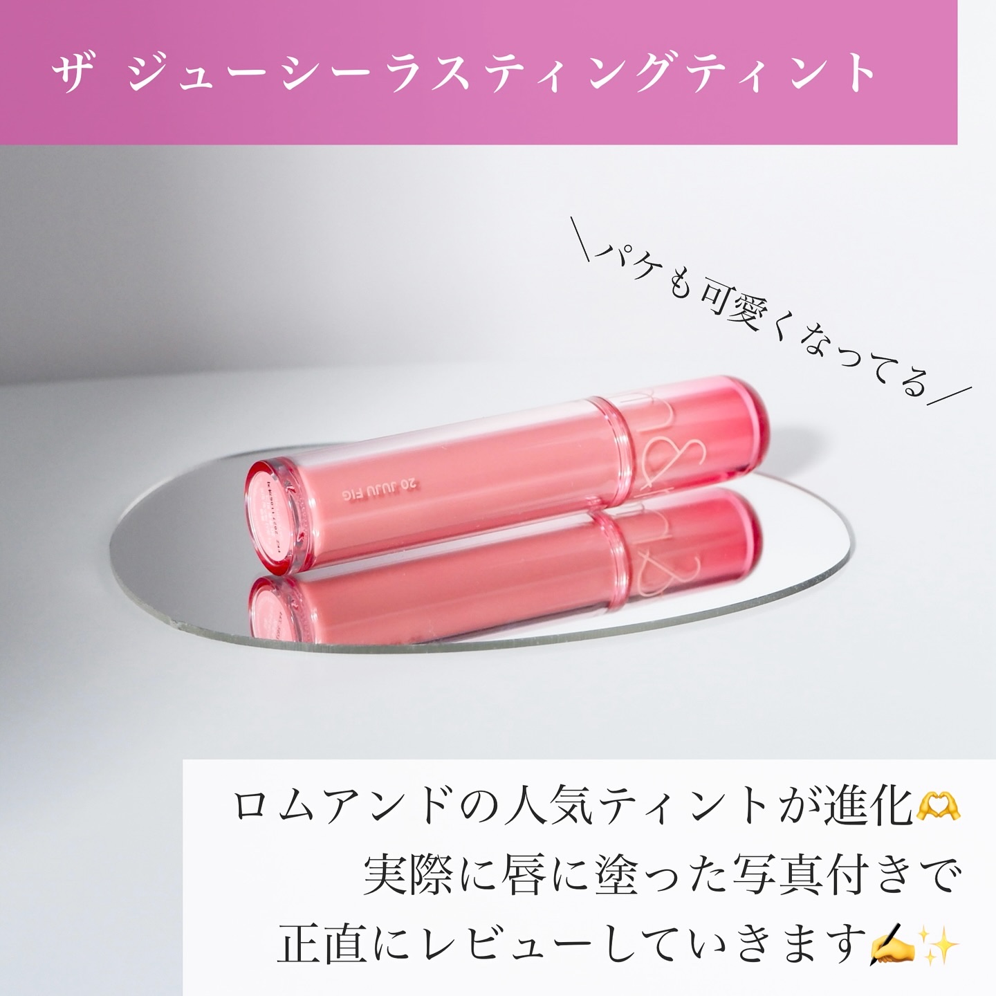 リニューアルしたジューシーラスティングティントの、新しく追加されたジュジュフィグを購入しました〜🥹🩷 発色の仕方がジュワッと、それこそジューシーな感じで可愛いし内側中心に塗布するとグラデーションみたいになって可愛いんです😵💫 色持ちは言うまでもなく、重たくも軽くもない中間な感じが使いやすかったです💭