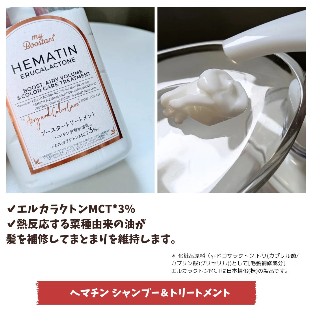 #マイブースターズ#ヘマチンブースターシャンプートリートメントスキンケアでも話題のヘマチン成分配合のシャンプー&トリートメントです。ヘマチン成分配合によりダメージ補修、カラーケア、根元ふんわり毛先まとまる、という効果が期待できるとのこと。私は...