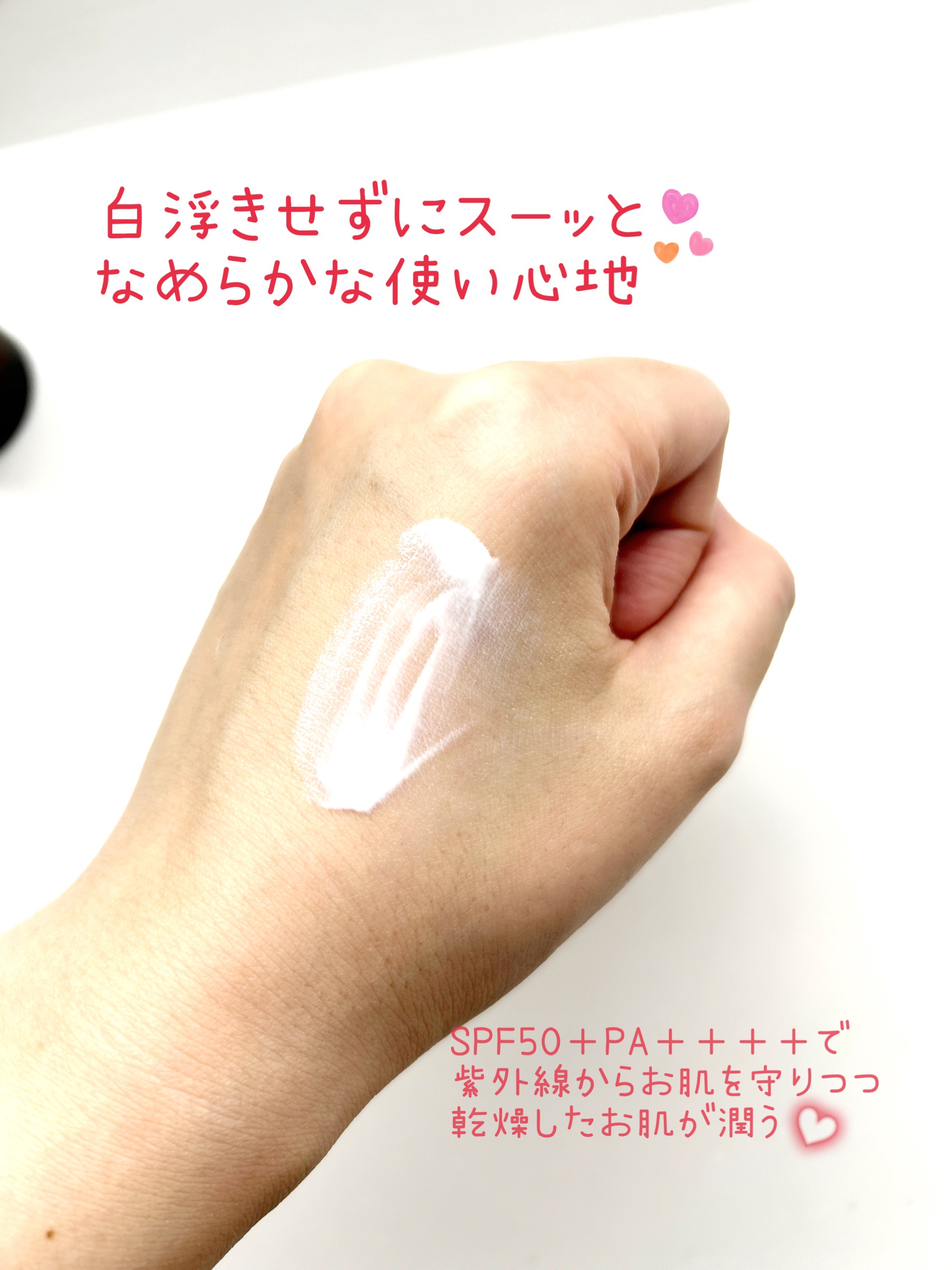 これ日焼け止め?ていうぐらい日焼け止めの成分が入っているのを感じさせない自然なテクスチャーと使い心地です❤️日焼け止め独特のキシキシ感やニオイが苦手だったんだけど、この商品は全く気にならない❣️すーっと伸びて白浮きもしないし肌に馴染むのが早い...
