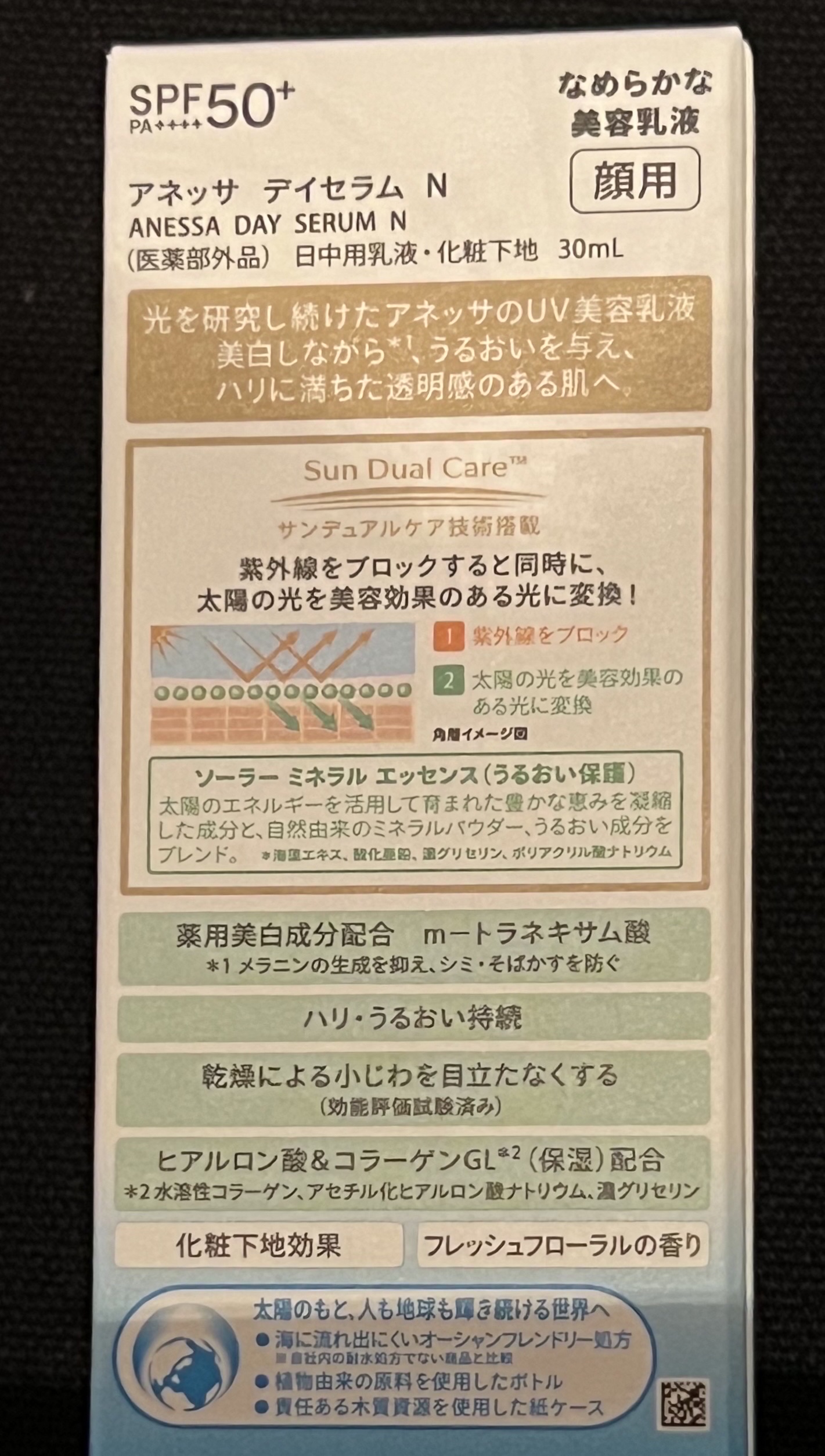 - 【医薬部外品】UV耐水性★ 太陽光を味方に。美肌を叶える「光速パール肌仕上げ」 強力UVカットに加え、美白※2ケアにトーンアップ仕上げを叶える エイジングケアUV※4 ※2 美白とは、メラニンの生成を抑え、シミ・そばかすを防ぐこと ○紫外線をカットしながら、美容効果のある”美肌光”に変換する 「サンデュアルケア技術」搭載 -ソーラーミネラルエッセンス(うるおい保護) *海藻エキス, 酸化亜鉛, 濃グリセリン, ポリアクリル酸ナトリウム ○薬用美白有効成分 - m-トラネキサム酸※5 ※5 トラネキサム酸 ○保湿成分 -ヒアルロン酸&コラーゲンGL※7 ※7 水溶性コラーゲン、アセチル化ヒアルロン酸ナトリウム、濃グリセリン ○ハリ・うるおい持続 ○乾燥による小じわを目立たなくする(効能評価試験済み) ○長時間保湿持続効果 ○キイチゴエキス(キメ整え) ○トーンアップ効果※8、くすみ・色ムラ補正※8 -ほんのり血色感を感じるライトピンクパールで、透明感のある肌へ ※8 メイクアップ効果による ○化粧下地効果 ○仕上がり持続効果 ○美容液のようななめらかな使い心地 ○フレッシュフローラルの香り ○ウォータープルーフ ○耐こすれ ○空気中の微粒子から付着を防ぎ、肌を守る -微粒子付着防止対応 ○海に流れ出にくいオーシャンフレンドリー処方※9 ※9 自社品内の耐水処方でない商品と比較 ○植物由来の原料を使用したボトル ○責任ある木質資源を使用した紙ケース ○オキシベンゾン無配合 ○ノンコメドジェニックテスト・アレルギーテスト済み (全ての方にニキビができない、アレルギーが起きないというわけではありません)