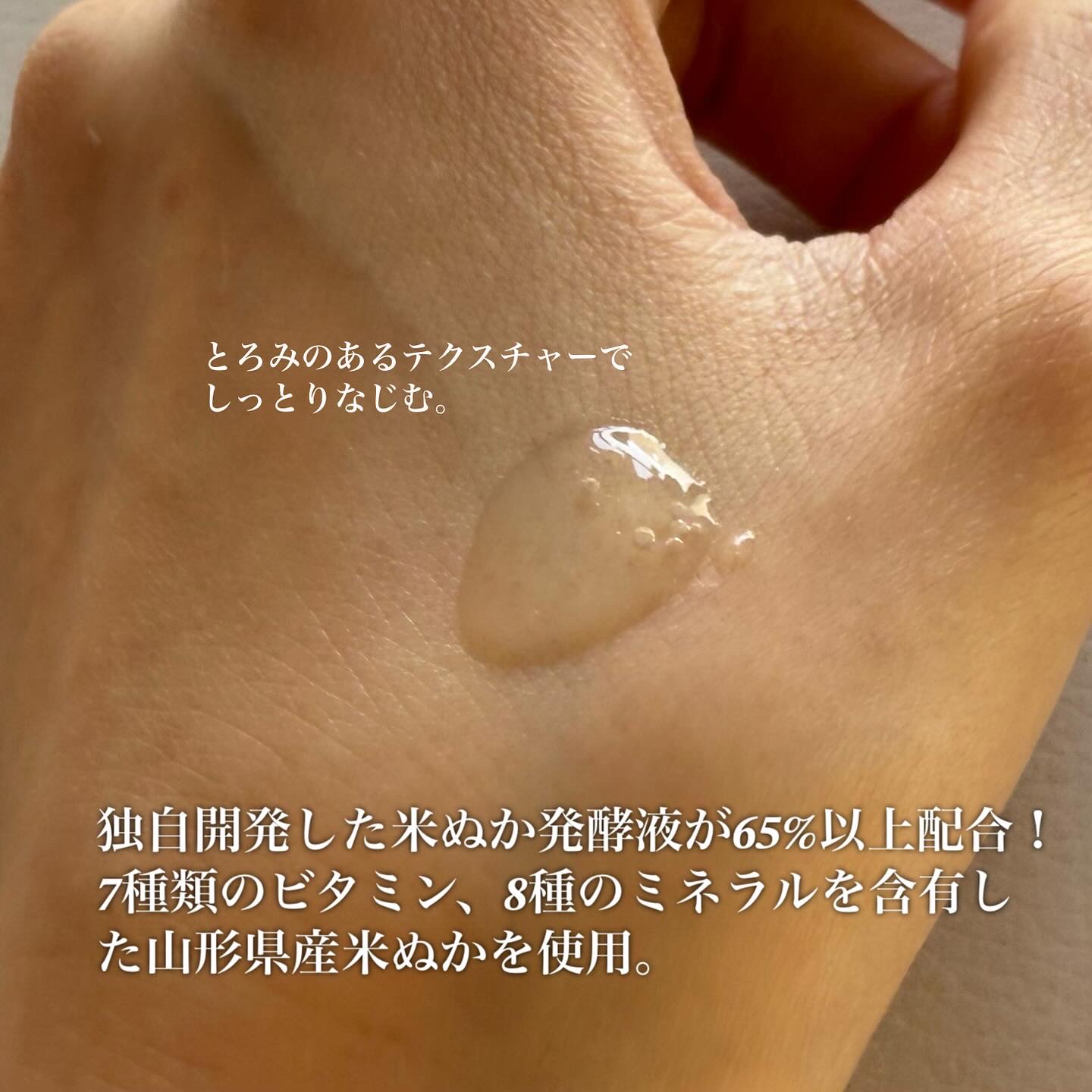 - 毎日肌に使うものだからこそ、天然由来成分*100%にこだわりました。 ⽔を使わず、配合成分の65%以上が肌にハリとうるおいを与える米ぬか発酵液でできた、濃厚なとろみのあるテクスチャーの美容液です。 化粧水の前に使用することで、保湿成分が角質層まで浸透しやすいなめらかな肌に整えます。 米ぬか発酵液の素となる米ぬかは7種のビタミン、8種のミネラルを含有した山形県産の米ぬかを使用しました。 発酵させることで、肌にうるおいを与えるアミノ酸の含有量が増加し、もっちりとしたハリのあるなめらかな肌に整えます。 発酵液以外にも発酵の過程で生成される酵母エキスや米ぬかから得られる米ぬか油も配合しており、米ぬかの成分を余すことなく活用しています。 *天然成分を化学的に反応させた成分を含みます [保湿成分] セラミド、5種のアミノ酸、加水分解ヒアルロン酸、グリチルリチン酸2K ※無香料、無着色、無鉱物油、パラベンフリー、アルコールフリー、フェノキシエタノールフリー、弱酸性 スティンギングテスト済み(すべての方にアレルギーや皮ふ刺激が起きないわけではありません) アレルギーテスト済み(すべての方にアレルギーが起きないわけではありません)