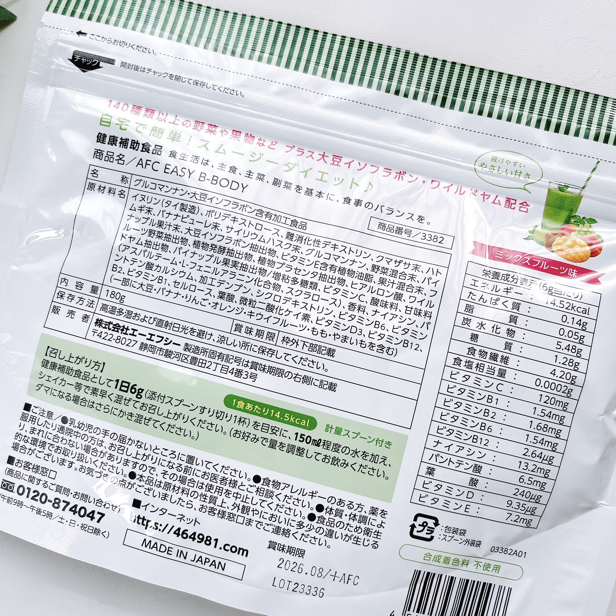 - ・原材料 イヌリン(タイ製造)、ポリデキストロース、難消化性デキストリン、クマザサ末、ハトムギ末、バナナピューレ末、サイリウムハスク末、グルコマンナン、野菜混合末、パイナップル果汁末、大豆イソフラボン抽出物、ビタミンE含有植物油脂、果汁混合末、フルーツ野菜抽出物、植物発酵抽出物、植物プラセンタ抽出物、ヒアルロン酸、ワイルドヤム抽出物、パイナップル果実抽出物/増粘多糖類、ビタミンC、酸味料、甘味料(アスパルテーム・L-フェニルアラニン化合物、スクラロース)、香料、ナイアシン、パントテン酸カルシウム、加工デンプン、シクロデキストリン、ビタミンB6、ビタミンB2、ビタミンB1、セルロース、葉酸、微粒二酸化ケイ素、ビタミンD3、ビタミンB12、(一部に大豆・バナナ・りんご・オレンジ・キウイフルーツ・もも・やまいもを含む) ・栄養成分表示 (1回6gあたり)エネルギー14.52kcal、たんぱく質0.14g、脂質0.05g、炭水化物5.48g、糖質1.28g、食物繊維4.20g、食塩相当量0.0002g、ビタミンC 120mg、ビタミンB1 1.54mg、ビタミンB2 1.68mg、ビタミンB6 1.54mg、ビタミンB12 2.64μg、ナイアシン 13.2mg、パントテン酸 6.5mg、葉酸 240μg、ビタミンD 9.35μg、ビタミンE 7.2mg