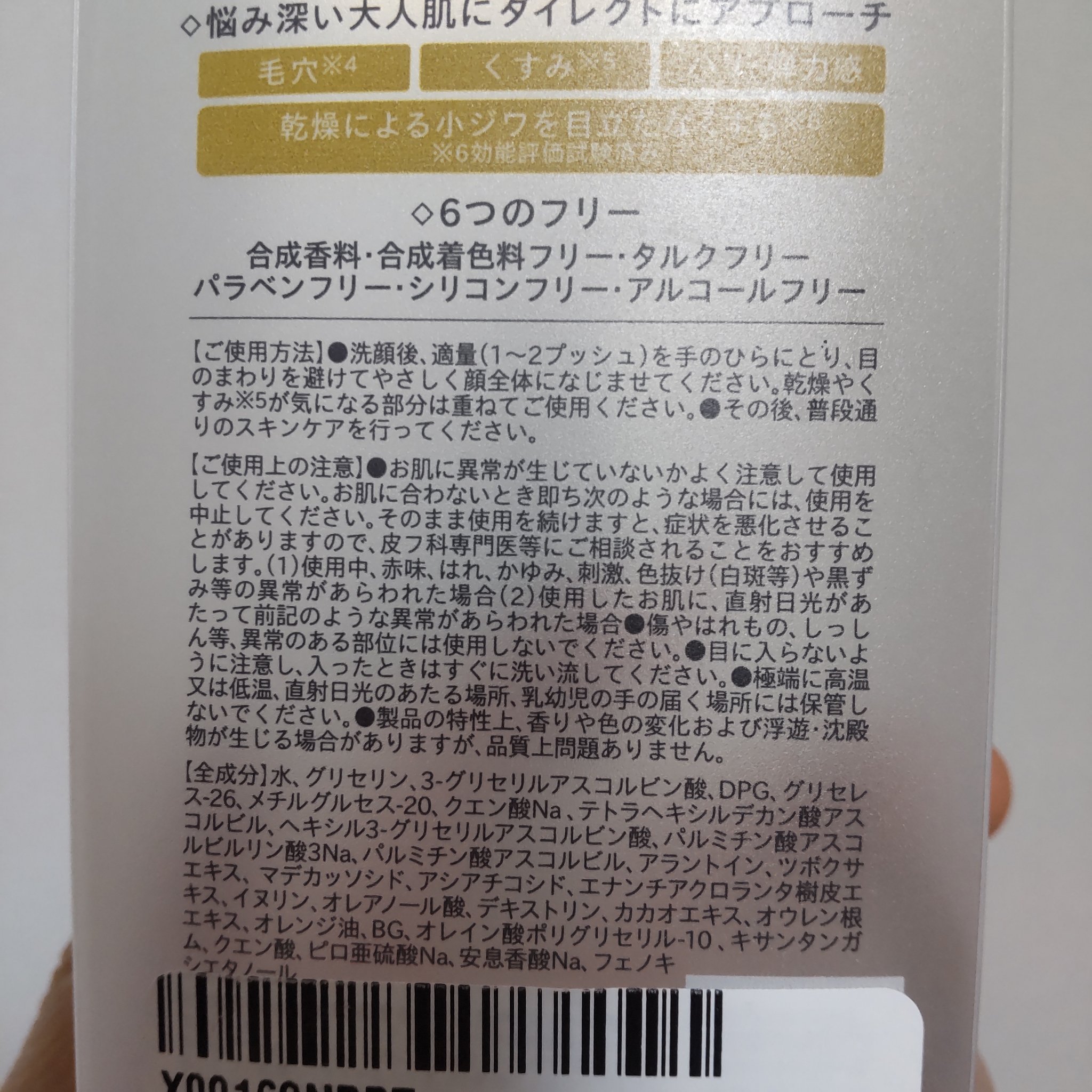 - <50mL> 水、グリセリン、3-グリセリルアスコルビン酸、DPG、グリセレス- 26、メチルグルセス- 20、クエン酸Na、テトラヘキシルデカン酸アスコルビル、ヘキシル3-グリセリルアスコルビン酸、パルミチン酸アスコルビルリン酸3Na、パルミチン酸アスコルビル、アラントイン、ツボクサエキス、マデカッソシド、アシアチコシド、エナンチアクロランタ樹皮エキス、イヌリン、オレアノール酸、デキストリン、カカオエキス、オウレン根エキス、オレンジ油、BG、オレイン酸ポリグリセリル-10、キサンタンガム、クエン酸、ピロ亜硫酸Na、安息香酸Na、フェノキシエタノール