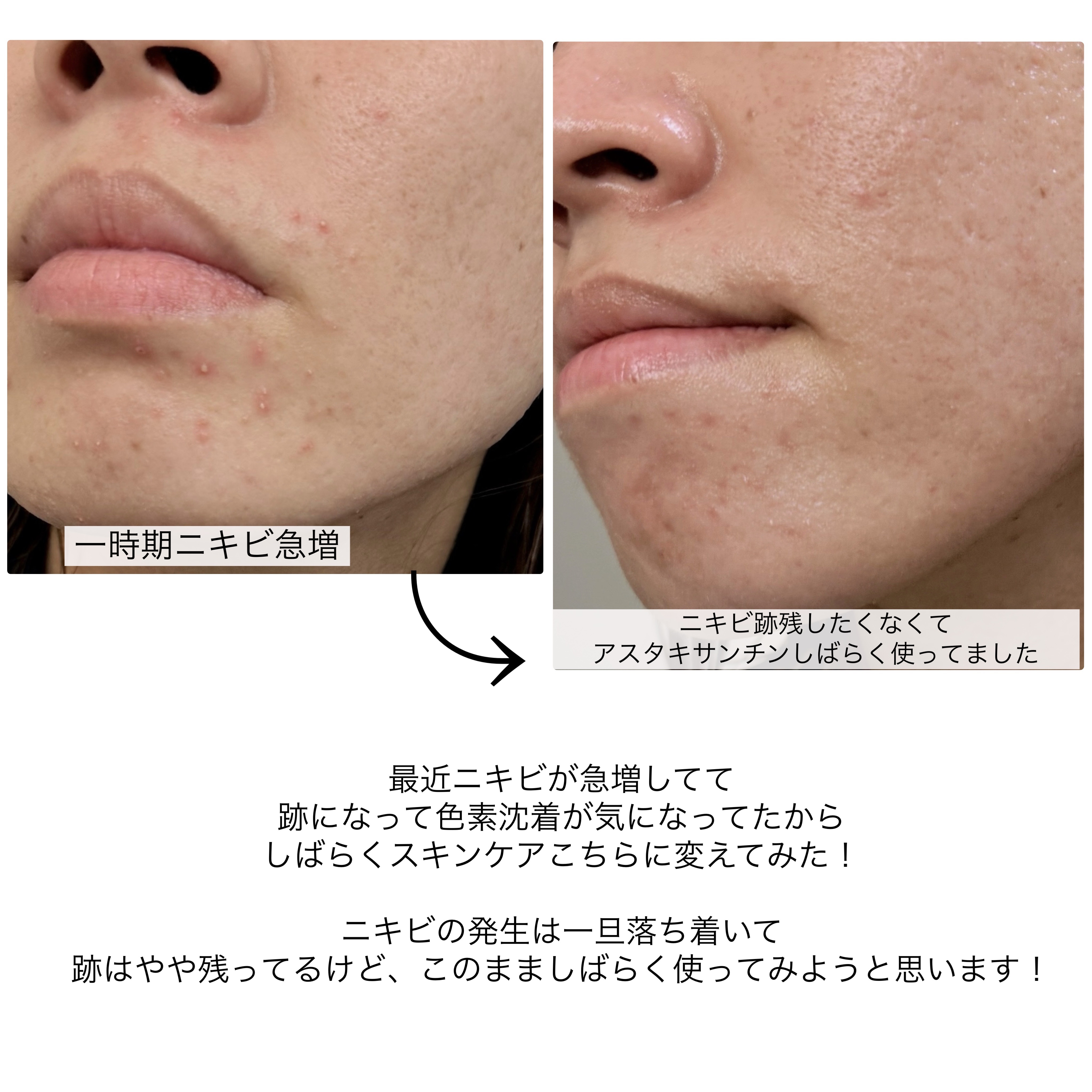 アスタキサンチンアンプルが肝斑シミケアにはおすすめ!お肌全体がトーンアップすることでしみ、肝斑が目立たなく感じました。 トラネキサム酸4.3%、ナイアシンアミド4.3%配合!ナノリポソームによってトラネキサム酸をより吸収されやすくしたスキンケアライン。 肌トーンケアにいい!くすみとぶ!肝斑やシミ自体が薄くなっている実感というよりは肌全体がトーンアップしてツヤっと光を反射してくれるので、