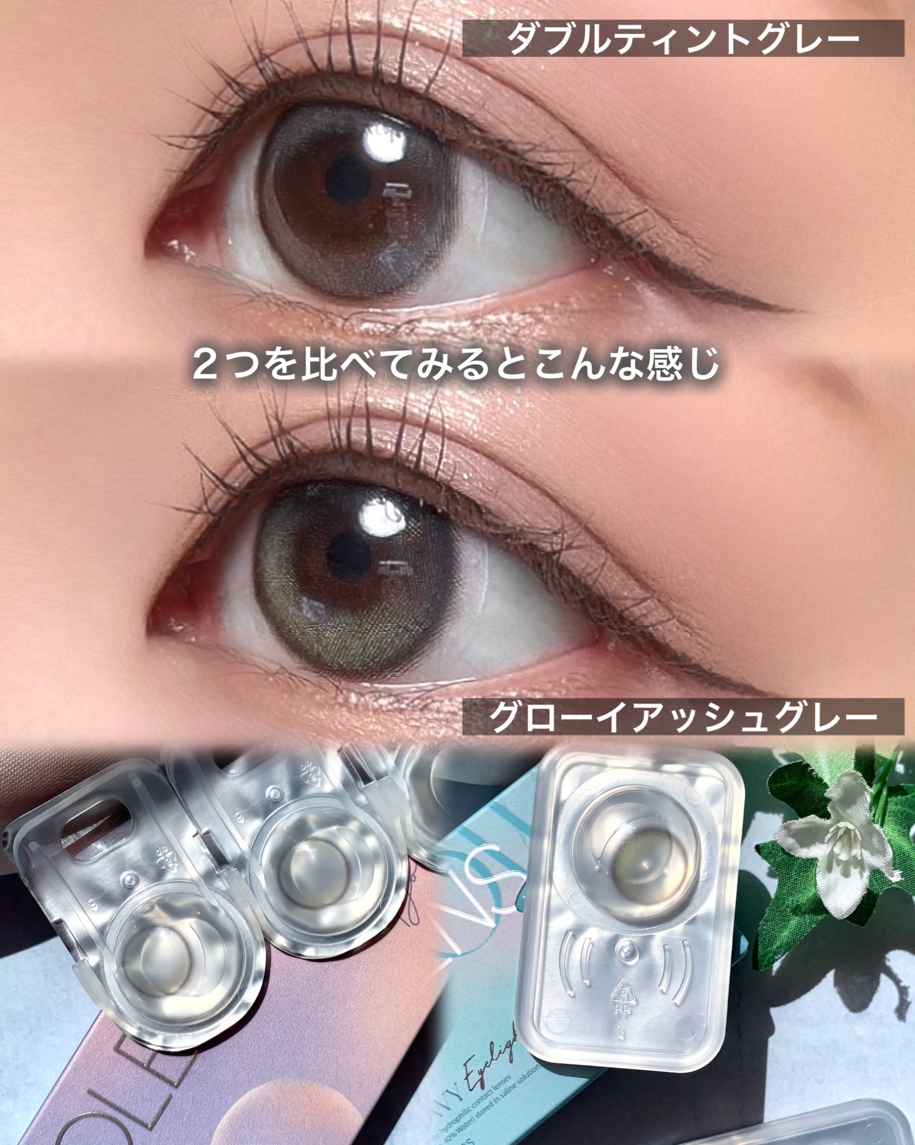 黒髪の方にめちゃめちゃおすすめ!! 派手になりがちなグレー系ですが、着色直径が小さめなので馴染みやすく使いやすいです。 ダブルのハイライトカラーのおかげで瞳に立体感が出て、うるうるキラキラしてみえます。 透明感爆上がり!!! グレー系のカラコン大好きで色々使ってきましたが、これはかなりお気に入りになりました♡