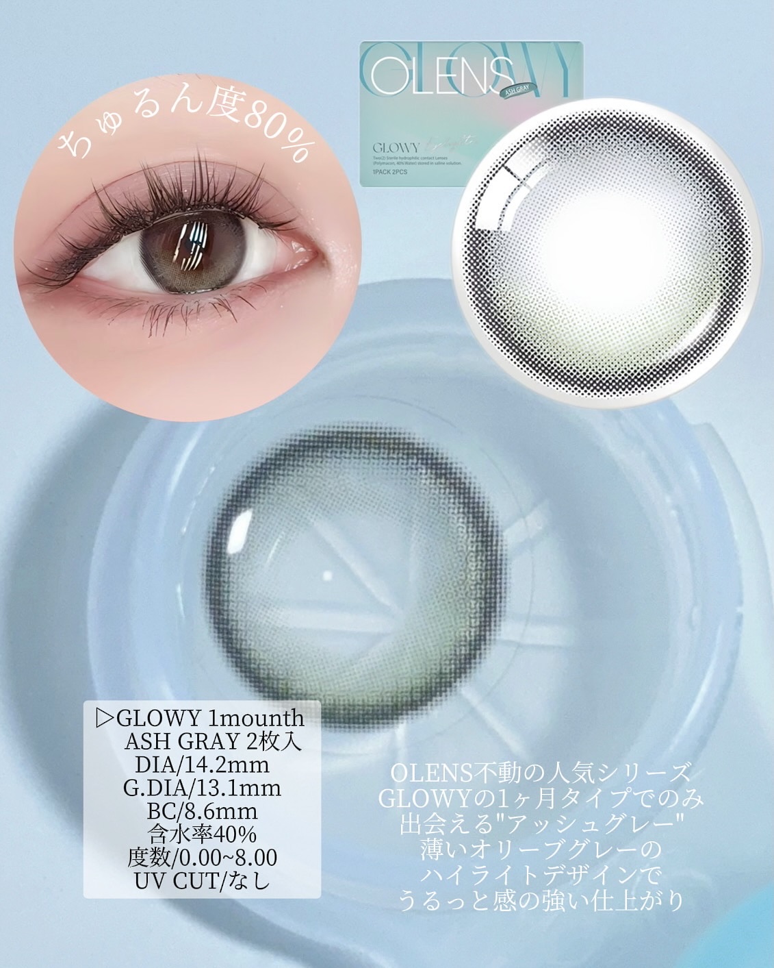 ちゅるんとハーフ顔✨ グレー水光カラコン🩶OLENSDoubleTint1dayグレーEyelighterGlowy1Month アッシュグレーDoubleTint1dayグレーDIA14.2GDIA12.9Water48%対称的に入ったハイ...