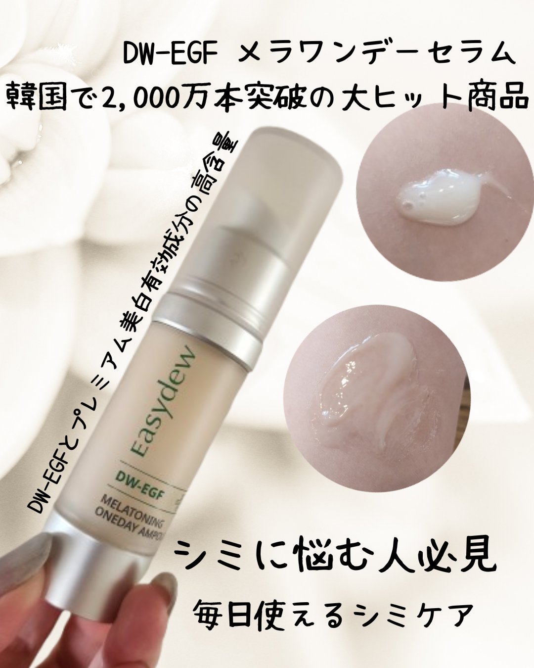 韓国を代表とする製薬会社が展開するシミ専門ドクターズコスメ・イージーデュー。独自開発のEGF成分及びトラネキサム酸、ナイアシンアミド、ビタミンC誘導体含有。美白効果が証明されている商品とか。 「イージーデュー DW-EGF メラワンデーセラム」韓国国内でまもなく2,000万本突破の大ヒット商品で、たった1週間でシミが48%減少し、2週間でメラニン色素が60%減少…と、ありますが。 でもコツコツと。何もしないのが一番良くないこと。