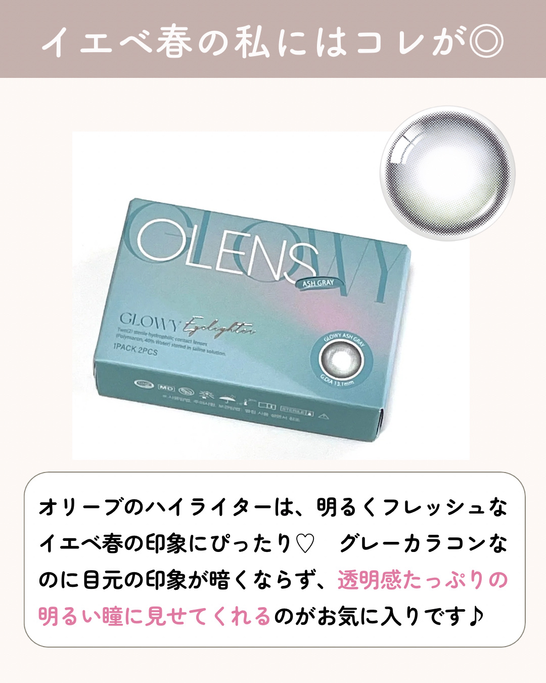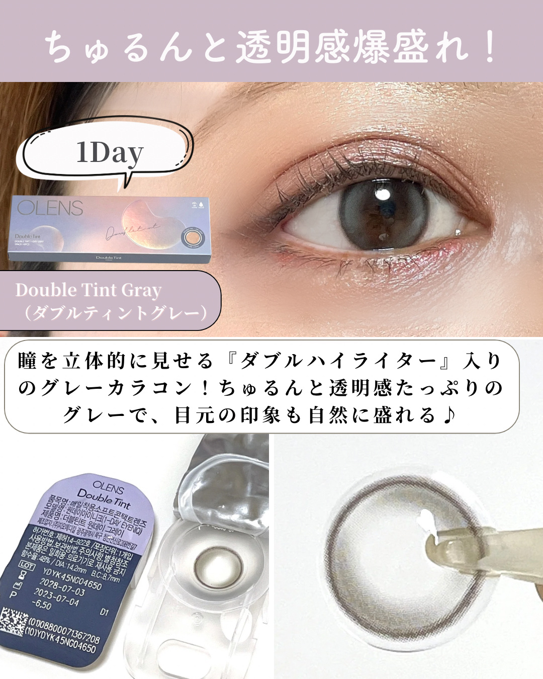 \ちゅるんと見える、水光レンズ🫧/☁️OLENS🛒DoubleTint1dayGRAY/BROWN📍DIA:14.2mm📍BC:8.6mm📍着色直径:12.9mm透明感たっぷりのダブルハイライター。ハイライターレンズって、目の中で回って左右非...