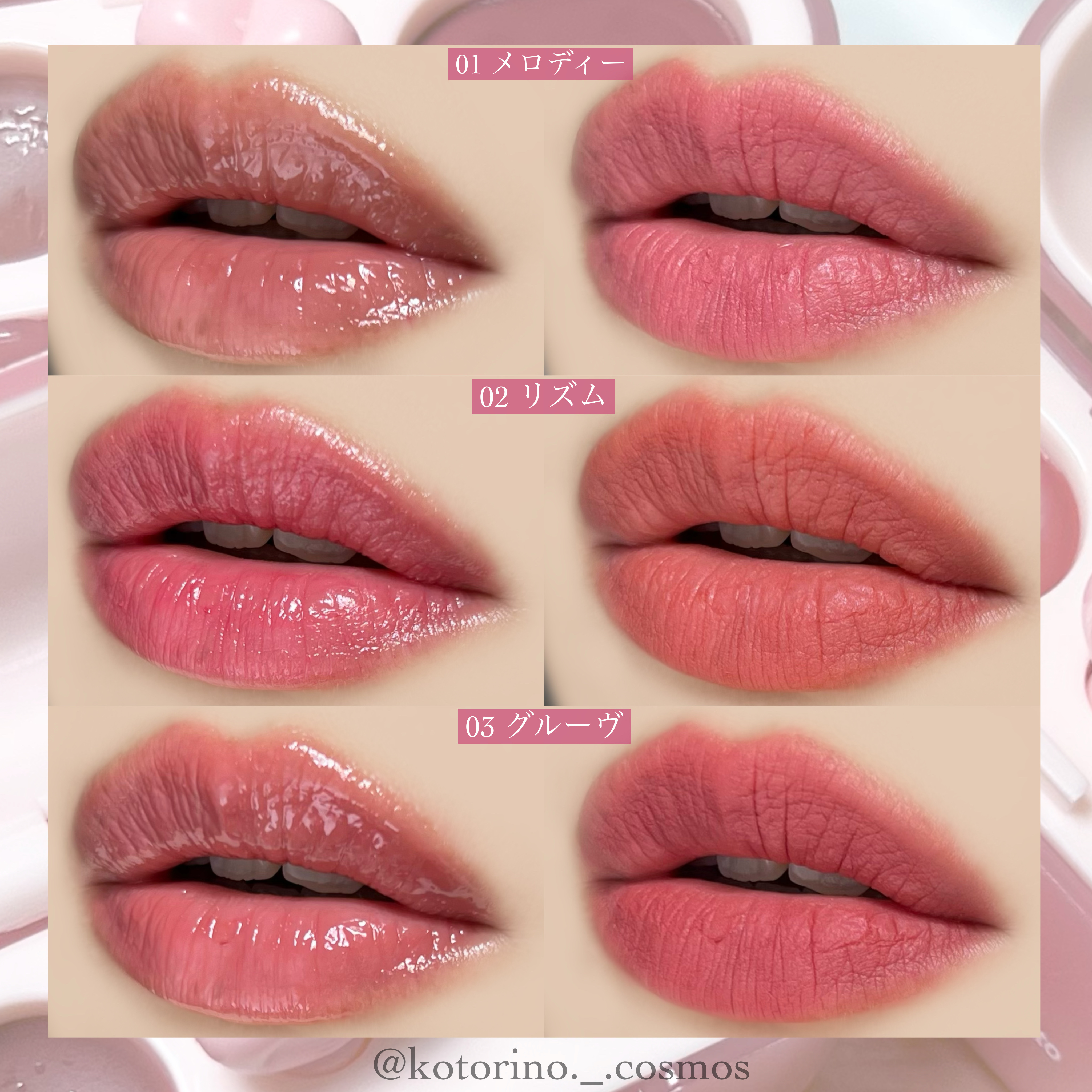 - <01 メロディー> ジメチコン、トリメリト酸トリトリデシル、ビスジグリセリルポリアシルアジペート-2、ダイマージリノール酸水添ヒマシ油、オクチルドデカノール、マイクロクリスタリンワックス、(イソステアリン酸ポリグリセリル-2/ダイマージリノール酸)コポリマー、水添ロジン酸メチル、ポリイソブテン、(ジメチコン/ビニルジメチコン)クロスポリマー、マカデミア種子油、ジメチコンクロスポリマー、トリベヘニン、パルミチン酸エチルヘキシル、酢酸トコフェロール、セチルPEG/PPG-10/1ジメチコン、ベヘニルアルコール、合成ワックス、トリイソステアリン酸ポリグリセリル-2、(VP/ヘキサデセン)コポリマー、酸化鉄、酸化チタン、トリエトキシカプリリルシラン、赤202、アルミナ、プロピルパラベン、香料、赤218 <02 リズム> ジメチコン、トリメリト酸トリトリデシル、ビスジグリセリルポリアシルアジペート-2、ダイマージリノール酸水添ヒマシ油、オクチルドデカノール、マイクロクリスタリンワックス、(ジメチコン/ビニルジメチコン)クロスポリマー、(イソステアリン酸ポリグリセリル-2/ダイマージリノール酸)コポリマー、ポリイソブテン、水添ロジン酸メチル、ジメチコンクロスポリマー、マカデミア種子油、トリベヘニン、パルミチン酸エチルヘキシル、セチルPEG/PPG-10/1ジメチコン、酢酸トコフェロール、酸化鉄、ベヘニルアルコール、トリイソステアリン酸ポリグリセリル-2、合成ワックス、(VP/ヘキサデセン)コポリマー、酸化チタン、赤202、赤201、プロピルパラベン、トリエトキシカプリリルシラン、香料、アルミナ <03 グルーヴ> ジメチコン、トリメリト酸トリトリデシル、ビスジグリセリルポリアシルアジペート-2、ダイマージリノール酸水添ヒマシ油、オクチルドデカノール、マイクロクリスタリンワックス、(ジメチコン/ビニルジメチコン)クロスポリマー、(イソステアリン酸ポリグリセリル-2/ダイマージリノール酸)コポリマー、ポリイソブテン、トリベヘニン、水添ロジン酸メチル、ジメチコンクロスポリマー、マカデミア種子油、パルミチン酸エチルヘキシル、セチルPEG/PPG-10/1ジメチコン、酸化鉄、酢酸トコフェロール、ベヘニルアルコール、トリイソステアリン酸ポリグリセリル-2、合成ワックス、(VP/ヘキサデセン)コポリマー、酸化チタン、赤202、プロピルパラベン、トリエトキシカプリリルシラン、香料、アルミナ
