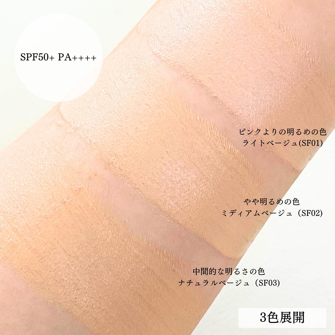 - <SF01 ライトベージュ(本体)> ジメチコン、水、酸化チタン、酸化亜鉛、BG、グリセリン、ジフェニルシロキシフェニルトリメチコン、ジカプリン酸ネオペンチルグリコール、メトキシケイヒ酸エチルヘキシル、PEG-10ジメチコン、キシリトール、イソステアリン酸、PEG-32、パルミチン酸アスコルビルリン酸3Na、ナイアシンアミド、グリシルグリシン、セラミドNG、セラミドNP、セラミドAP、セルロース、EDTA-2Na、キサンタンガム、クオタニウム-18ヘクトライト、ステアリン酸Mg、セスキイソステアリン酸ソルビタン、トリメチルシロキシケイ酸、ノイバラ果実エキス、ハイドロゲンジメチコン、フィトステロールズ、ラウロイルグルタミン酸Na、リシン、塩化Mg、水酸化Al、水添レシチン、硫酸Mg、フェノキシエタノール、マイカ、合成フルオロフロゴパイト、酸化鉄 <SF02 ミディアムベージュ(本体)> ジメチコン、水、酸化チタン、酸化亜鉛、BG、グリセリン、ジフェニルシロキシフェニルトリメチコン、ジカプリン酸ネオペンチルグリコール、メトキシケイヒ酸エチルヘキシル、PEG-10ジメチコン、キシリトール、イソステアリン酸、PEG-32、パルミチン酸アスコルビルリン酸3Na、ナイアシンアミド、グリシルグリシン、セラミドNG、セラミドNP、セラミドAP、セルロース、EDTA-2Na、キサンタンガム、クオタニウム-18ヘクトライト、ステアリン酸Mg、セスキイソステアリン酸ソルビタン、トリメチルシロキシケイ酸、ノイバラ果実エキス、ハイドロゲンジメチコン、フィトステロールズ、ラウロイルグルタミン酸Na、リシン、塩化Mg、水酸化Al、水添レシチン、硫酸Mg、フェノキシエタノール、マイカ、合成フルオロフロゴパイト、酸化鉄 <SF03 ナチュラルベージュ(本体)> ジメチコン、水、酸化チタン、酸化亜鉛、BG、グリセリン、ジフェニルシロキシフェニルトリメチコン、ジカプリン酸ネオペンチルグリコール、メトキシケイヒ酸エチルヘキシル、PEG-10ジメチコン、キシリトール、イソステアリン酸、PEG-32、パルミチン酸アスコルビルリン酸3Na、ナイアシンアミド、グリシルグリシン、セラミドNG、セラミドNP、セラミドAP、セルロース、EDTA-2Na、キサンタンガム、クオタニウム-18ヘクトライト、ステアリン酸Mg、セスキイソステアリン酸ソルビタン、トリメチルシロキシケイ酸、ノイバラ果実エキス、ハイドロゲンジメチコン、フィトステロールズ、ラウロイルグルタミン酸Na、リシン、塩化Mg、水酸化Al、水添レシチン、硫酸Mg、フェノキシエタノール、マイカ、合成フルオロフロゴパイト、酸化鉄 <SF01 ライトベージュ(リフィル)> ジメチコン、水、酸化チタン、酸化亜鉛、BG、グリセリン、ジフェニルシロキシフェニルトリメチコン、ジカプリン酸ネオペンチルグリコール、メトキシケイヒ酸エチルヘキシル、PEG-10ジメチコン、キシリトール、イソステアリン酸、PEG-32、パルミチン酸アスコルビルリン酸3Na、ナイアシンアミド、グリシルグリシン、セラミドNG、セラミドNP、セラミドAP、セルロース、EDTA-2Na、キサンタンガム、クオタニウム-18ヘクトライト、ステアリン酸Mg、セスキイソステアリン酸ソルビタン、トリメチルシロキシケイ酸、ノイバラ果実エキス、ハイドロゲンジメチコン、フィトステロールズ、ラウロイルグルタミン酸Na、リシン、塩化Mg、水酸化Al、水添レシチン、硫酸Mg、フェノキシエタノール、マイカ、合成フルオロフロゴパイト、酸化鉄 <SF02 ミディアムベージュ(リフィル)> ジメチコン、水、酸化チタン、酸化亜鉛、BG、グリセリン、ジフェニルシロキシフェニルトリメチコン、ジカプリン酸ネオペンチルグリコール、メトキシケイヒ酸エチルヘキシル、PEG-10ジメチコン、キシリトール、イソステアリン酸、PEG-32、パルミチン酸アスコルビルリン酸3Na、ナイアシンアミド、グリシルグリシン、セラミドNG、セラミドNP、セラミドAP、セルロース、EDTA-2Na、キサンタンガム、クオタニウム-18ヘクトライト、ステアリン酸Mg、セスキイソステアリン酸ソルビタン、トリメチルシロキシケイ酸、ノイバラ果実エキス、ハイドロゲンジメチコン、フィトステロールズ、ラウロイルグルタミン酸Na、リシン、塩化Mg、水酸化Al、水添レシチン、硫酸Mg、フェノキシエタノール、マイカ、合成フルオロフロゴパイト、酸化鉄 <SF03 ナチュラルベージュ(リフィル )> ジメチコン、水、酸化チタン、酸化亜鉛、BG、グリセリン、ジフェニルシロキシフェニルトリメチコン、ジカプリン酸ネオペンチルグリコール、メトキシケイヒ酸エチルヘキシル、PEG-10ジメチコン、キシリトール、イソステアリン酸、PEG-32、パルミチン酸アスコルビルリン酸3Na、ナイアシンアミド、グリシルグリシン、セラミドNG、セラミドNP、セラミドAP、セルロース、EDTA-2Na、キサンタンガム、クオタニウム-18ヘクトライト、ステアリン酸Mg、セスキイソステアリン酸ソルビタン、トリメチルシロキシケイ酸、ノイバラ果実エキス、ハイドロゲンジメチコン、フィトステロールズ、ラウロイルグルタミン