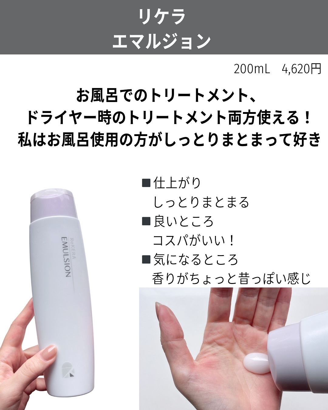 【#リケラ/#エマルジョン】インバスでもアウトバスでも使えるそう知らなかったのでアウトバスで使っていました。滑らかなテクスチャーで少量でよく伸びます◎容器的にドバっと出やすいので注意が必要。かなり保湿感はあります。しっとりするけど、少しごわつ...