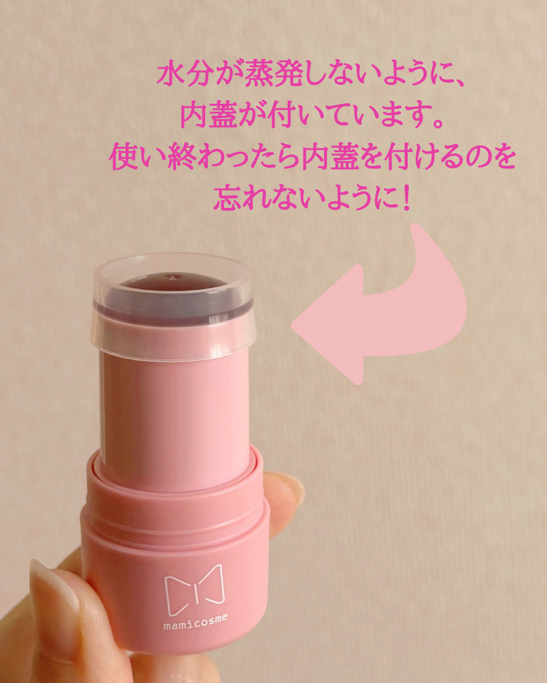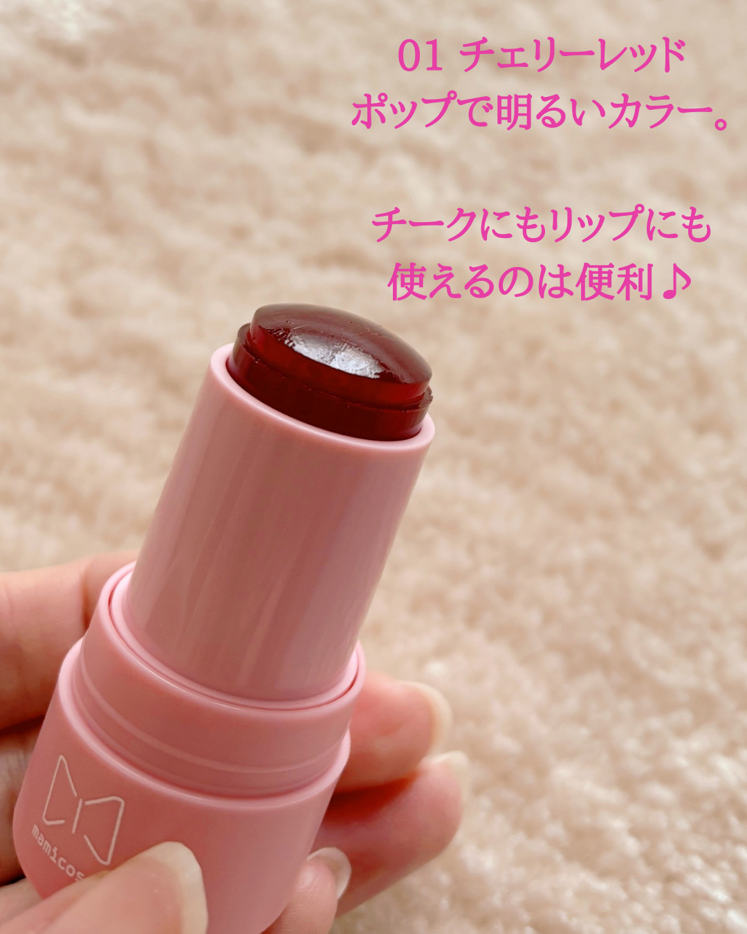mamicosmeグミティント01チェリーレッドまるでグミのような新感触のチーク&リップでぷにっとした質感と、はじけるジューシーカラーが特徴です!唇や頬にポンポンと押し当てて使うのでぷにぷにの質感がクセになる✨ポンっとする回数によって濃さが自...