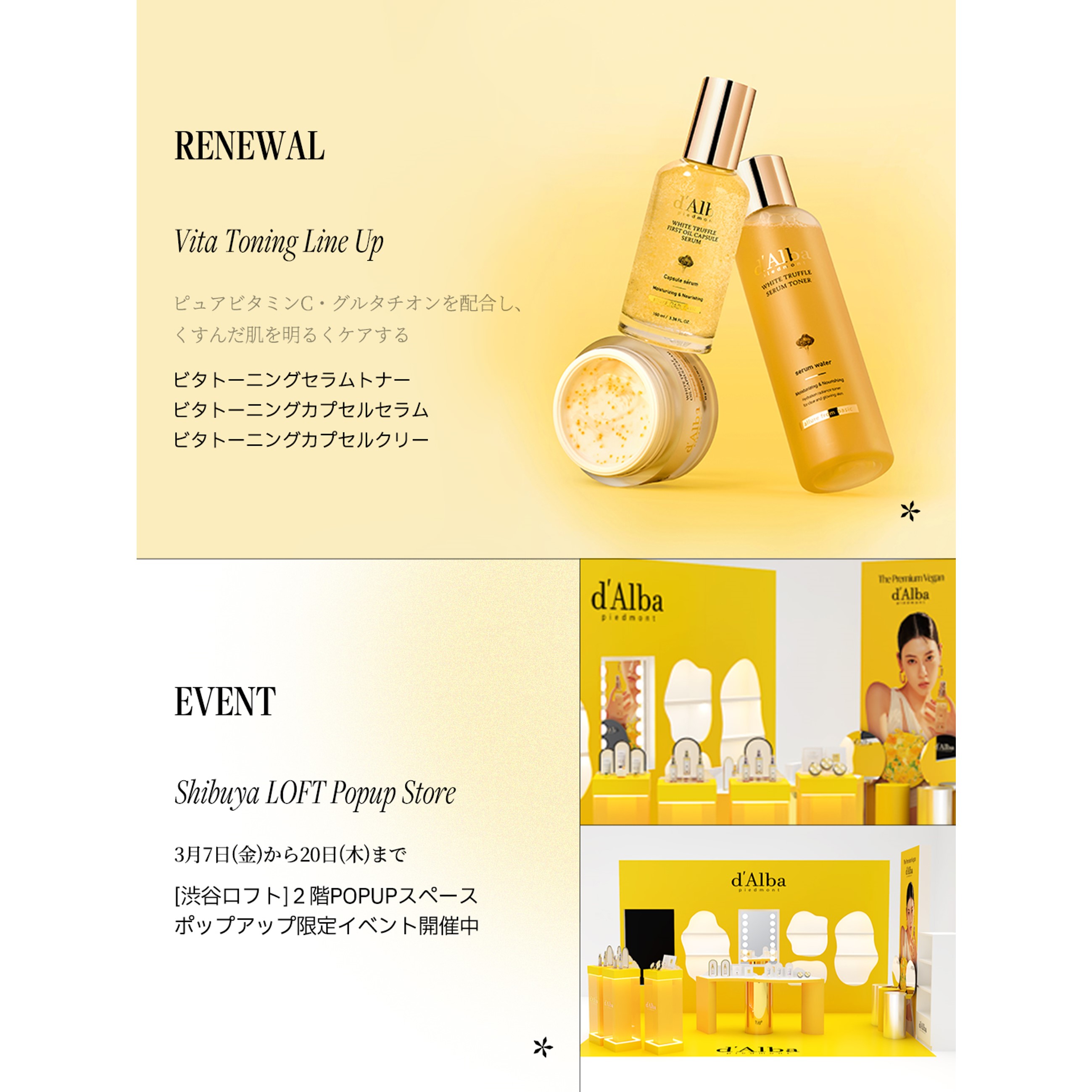 \あなたはどっち派?私は#ビタ派💛/季節の変わり目のゆらぎがちな肌や夏にダメージを受けた肌はビタラインでケア👏🏻🤍⋆⋆✔︎︎︎︎d'Albaビタトーニングセラムトナービタトーニングカプセルセラムビタトーニングカプセルクリームビタカプセルアンチ...