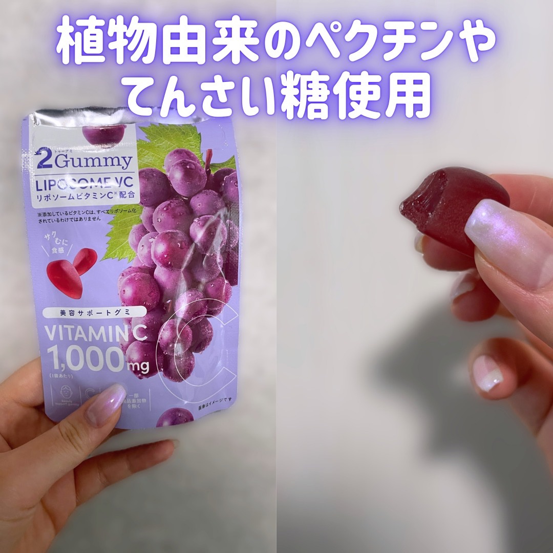- 「食べるリポソームビタミンC」登場。2Gummyは、話題のリポソームビタミンCを配合したグミ。量と頻度に着目し、1袋にビタミンCを1,000mg配合。おやつ感覚で、いつでもどこでもビタミンCをチャージできます。