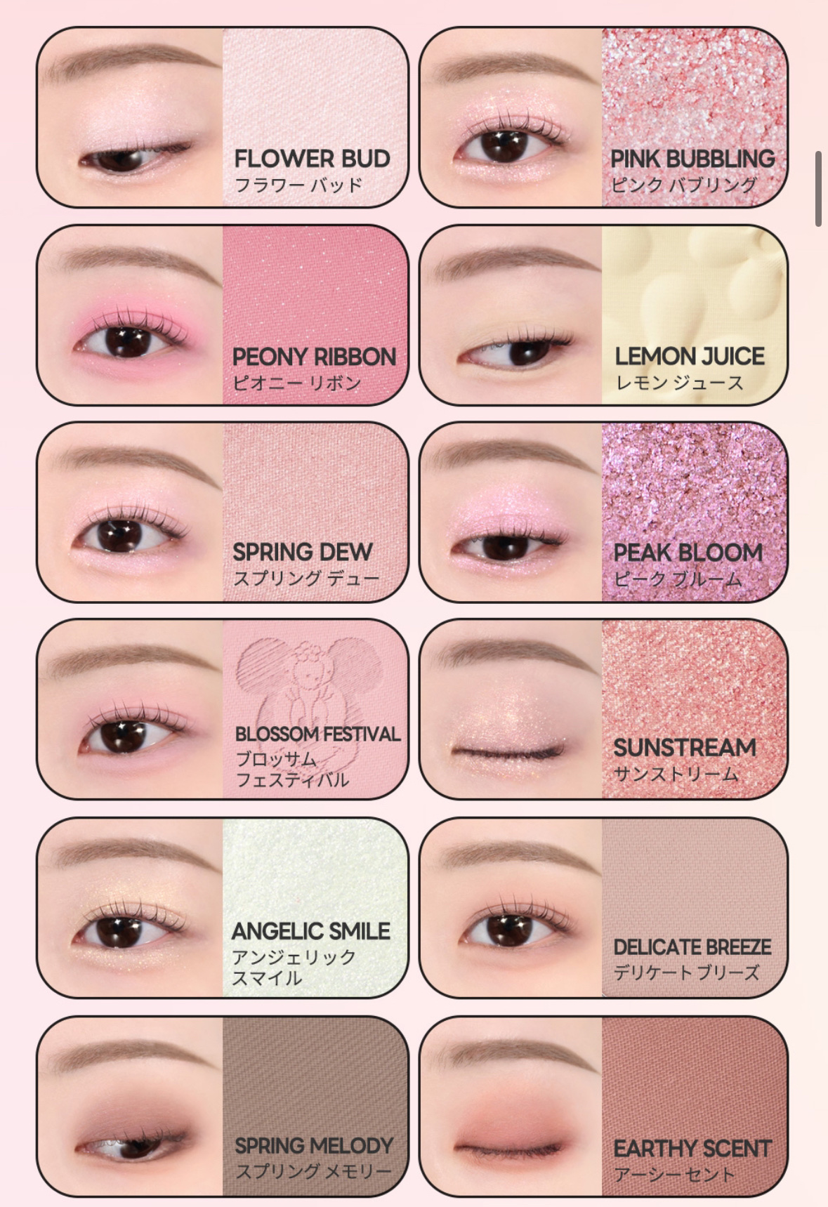 - 軽やかテクスチャーが目元に密着し、抜け感のある色使いが楽しめるデイリーパレット <101 ローズダイアリー(ROSE DIARY)> オーナメントを飾り付けたローズツリーのようにほのかに輝くウォームローズピンクカラー(イエベ秋)。 <102 ミュートアーカイブ(MUTE ARCHIVE)> 少女たちのピンキーなホームパーティームードを盛り込んだクールでヌーディーなミューテッドモブカラー(ブルべ夏ミュート)。 <103 バニラヘイズ(VANILLA HAZE)> 焼きたてのジンジャークッキーのように暖かく香ばしいウォームミュートカラー(イエベ秋ミュート)。 <104 GHR ピンク(GYEONGHOERU FLOWER FESTIVAL)> 春の日の美しく優雅な色を詰め込んだピンクカラーパレット。イエベ春&ブルベ夏におすすめのパレットです。 <105 DSG バイオレット(DEOKSUGUNG STONE WALL ROAD)> ほんのりピンクがかった柔らかなモーブカラーパレット。ブルベ夏&ブルベ冬におすすめのパレットです。 <106 DBG コーラル(GYEONGBOKGUNG STROLL)> 明るい日差しの色を取り入れたデイリーなコーラルカラー。イエベ春&ブライト秋におすすめのパレットです。
