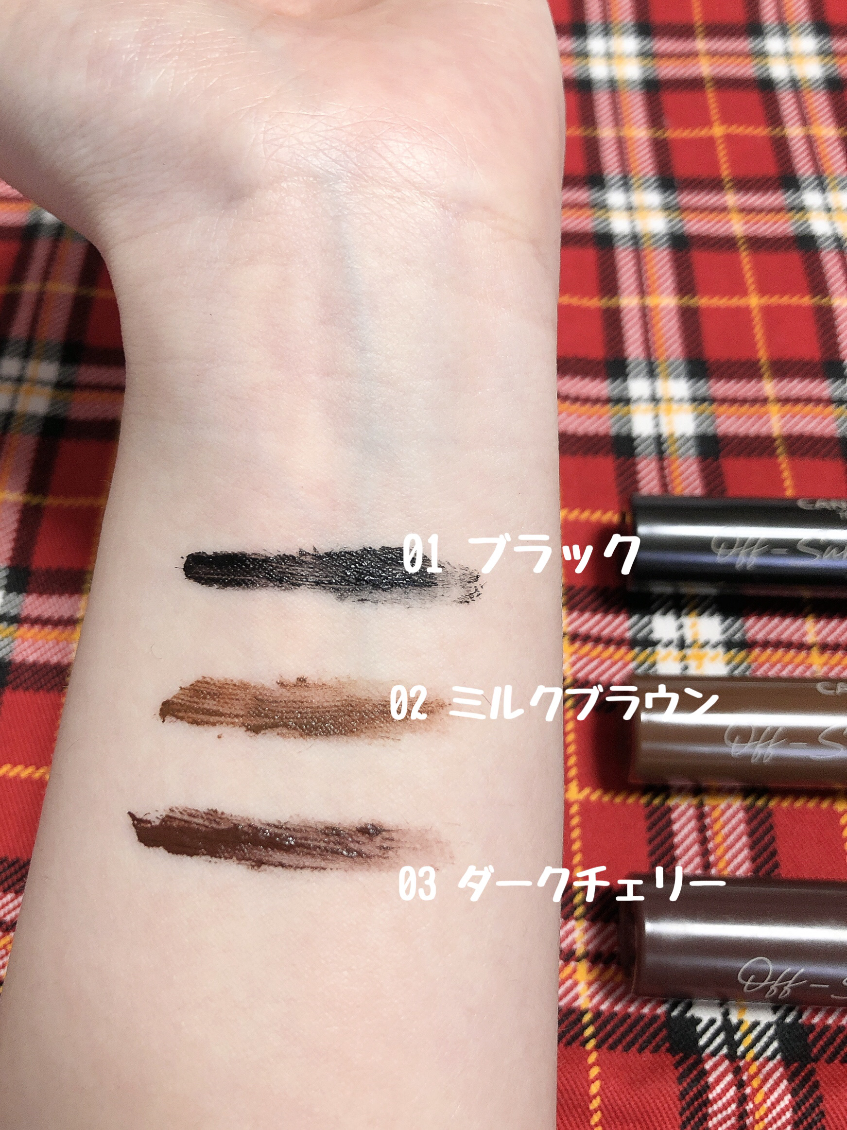 - <01 ブラック> 水、アクリレーツコポリマー、カルナウバロウ、BG、ミツロウ、PVP、(VP/エイコセン)コポリマー、シリカ、ステアリン酸、ステアリン酸ソルビタン、セテス-20、ベヘニルアルコール、ポリステアリン酸スクロース、AMP、ナイロン-66、ヒドロキシエチルセルロース、フェノキシエタノール、デヒドロ酢酸Na、ラウレス-21、ポリアクリル酸Na、(+/-)酸化鉄 <02 ミルクブラウン> 水、アクリレーツコポリマー、カルナウバロウ、BG、ミツロウ、PVP、(VP/エイコセン)コポリマー、シリカ、ステアリン酸、ステアリン酸ソルビタン、セテス-20、ベヘニルアルコール、ポリステアリン酸スクロース、AMP、ナイロン-66、ヒドロキシエチルセルロース、フェノキシエタノール、デヒドロ酢酸Na、ラウレス-21、ポリアクリル酸Na、(+/-)酸化鉄