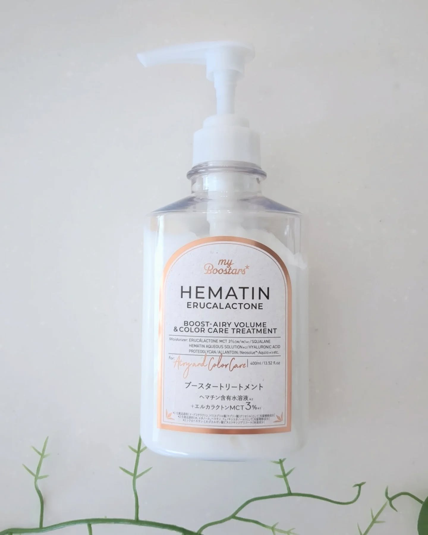 注目成分「ヘマチン」配合のシャンプー&トリートメント。 トリートメントにはヘマチンに加えて、補修成分である植物由来のエルカラクトンを3%配合。 シャンプーはブラウンボトル。濃密な泡立ちで洗ってても泡はヘタリにくく、すすぎ時の泡切れもよく、シャンプーだけでもとぅるんっとしっとりする使い心地。