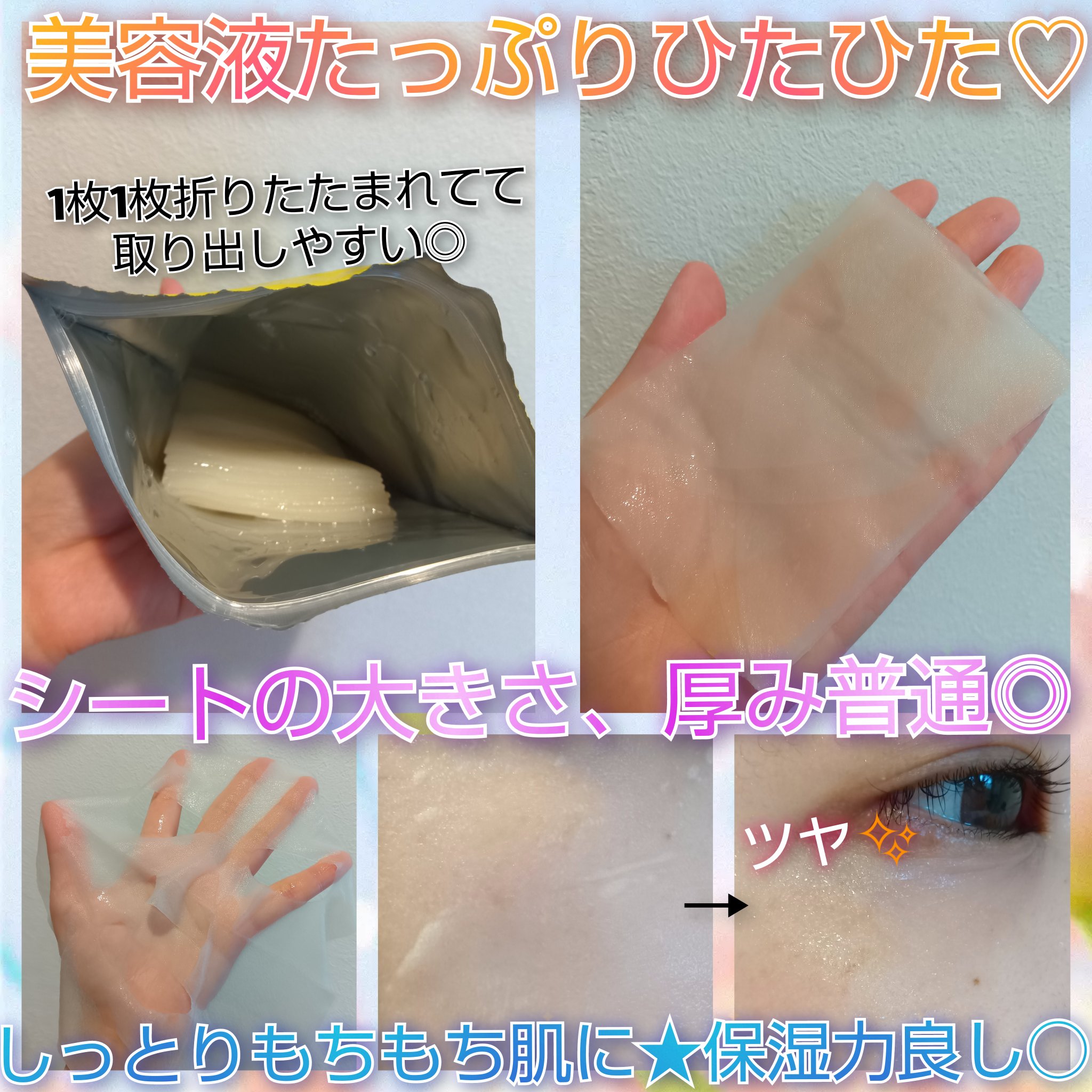 | 薄めなシートに美容液が たっぷりヒタヒタに含まれています☺︎ | 詳細を見る | |