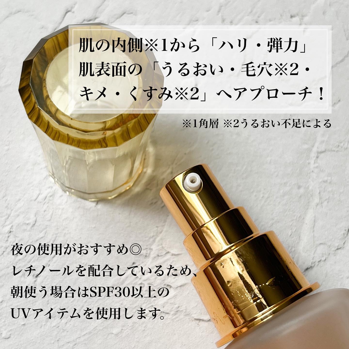 純粋レチノール*1×ビタミンC*2配合✨ \黄色とオレンジ色のセラム/オイル層とエッセンス層を、使う直前に2秒間シェイク🫨 肌の角層からハリ・弾力のある肌に導き、肌表面の「うるおい・毛穴*3・キメ・くすみ*3」へアプローチ🙆♀️