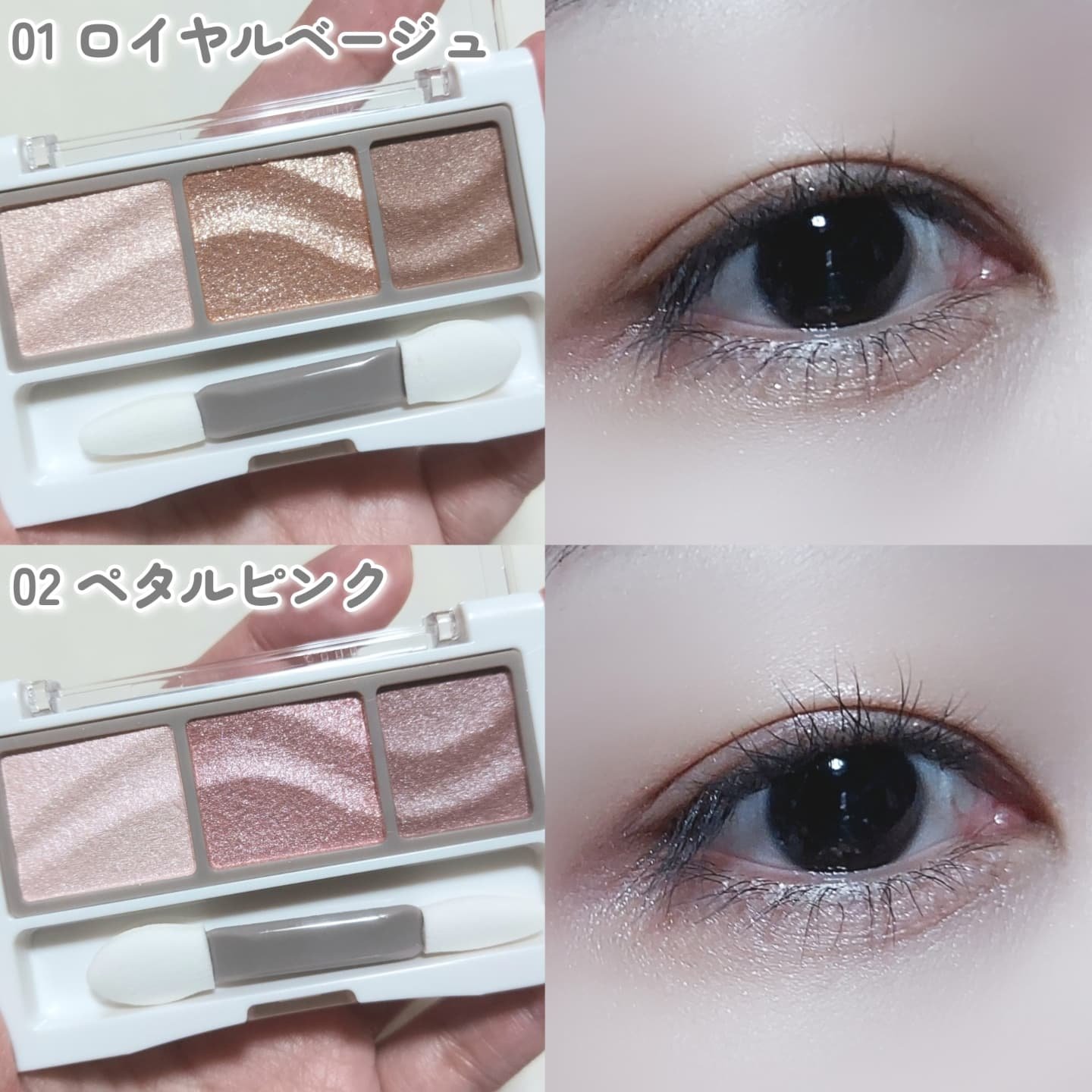 - 簡単に繊細グラデが作れる透けうる3色アイシャドウ。 使い方に迷わない!3色を重ねるだけで作りこんだような繊細グラデーションが完成。うるっと透け感×高発色で自然にくっきりとした目元に。 光を散乱させてくすみを払うソフトフォーカス効果パウダーを高配合。くすみにくく透き通るような明るい仕上がり。 しっとりとしたオイルコーティング処方で、ピタッと密着してヨレにくい。 ダブルエンドチップ付き。 01 ロイヤルベージュ:ベーシックに使いやすいブラウンベージュ。 02 ペタルピンク:ふんわり血色感をまとうライラックピンク。