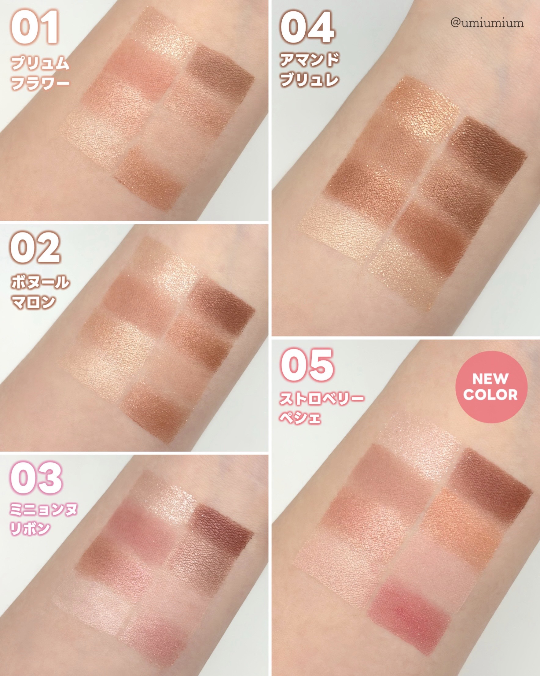 - <01 プリュムフラワー> 【A,H】タルク、ジフェニルシロキシフェニルトリメチコン、アルミナ、ミリスチン酸亜鉛、イソノナン酸イソトリデシル、リンゴ酸ジイソステアリル、トリ(カプリル酸/カプリン酸)グリセリル、ワセリン、シリカ、ラウロイルリシン、合成フルオロフロゴパイト、アモジメチコン、エチルパラベン、メチルパラベン、ジステアリン酸Al、カプリリルグリコール、エチルヘキシルグリセリン、水酸化Al、酸化スズ、水、デヒドロ酢酸Na、ステアロイルグルタミン酸2Na、ジメチコン、アルガニアスピノサ核油、ホホバ種子油、水添ポリイソブテン、PG、BG、ヒアルロン酸Na、フェノキシエタノール、カミツレ花エキス、トコフェロール、センチフォリアバラ花エキス、マイカ、酸化チタン、酸化鉄、赤226、グンジョウ、カオリン 【B,C,F,G】タルク、ホウケイ酸(Ca/Al)、アルミナ、ジフェニルシロキシフェニルトリメチコン、ミリスチン酸亜鉛、イソノナン酸イソトリデシル、リンゴ酸ジイソステアリル、トリ(カプリル酸/カプリン酸)グリセリル、ワセリン、ラウロイルリシン、シリカ、ジステアリン酸Al、エチルパラベン、メチルパラベン、水酸化Al、酸化スズ、カプリリルグリコール、エチルヘキシルグリセリン、ステアロイルグルタミン酸2Na、水、デヒドロ酢酸Na、アモジメチコン、ジメチコン、アルガニアスピノサ核油、ホホバ種子油、水添ポリイソブテン、PG、BG、ヒアルロン酸Na、フェノキシエタノール、カミツレ花エキス、トコフェロール、センチフォリアバラ花エキス、酸化チタン、マイカ、酸化鉄、赤226、グンジョウ、コンジョウ、カオリン 【D,E】タルク、ミリスチン酸亜鉛、リンゴ酸ジイソステアリル、トリ(カプリル酸/カプリン酸)グリセリル、ワセリン、ラウロイルリシン、シリカ、ジメチコン、イソノナン酸イソノニル、アモジメチコン、水酸化Al、マイクロクリスタリンワックス、ステアロイルグルタミン酸2Na、エチルパラベン、メチルパラベン、カプリリルグリコール、エチルヘキシルグリセリン、水、デヒドロ酢酸Na、酸化スズ、アルガニアスピノサ核油、ホホバ種子油、水添ポリイソブテン、PG、BG、ヒアルロン酸Na、フェノキシエタノール、カミツレ花エキス、トコフェロール、センチフォリアバラ花エキス、マイカ、酸化チタン、酸化鉄、グンジョウ、赤226、カオリン <02 ボヌールマロン> 【A,H】タルク、ジフェニルシロキシフェニルトリメチコン、アルミナ、ミリスチン酸亜鉛、イソノナン酸イソトリデシル、リンゴ酸ジイソステアリル、トリ(カプリル酸/カプリン酸)グリセリル、ワセリン、ラウロイルリシン、合成フルオロフロゴパイト、シリカ、水酸化Al、アモジメチコン、エチルパラベン、メチルパラベン、ジステアリン酸Al、酸化スズ、カプリリルグリコール、エチルヘキシルグリセリン、水、デヒドロ酢酸Na、ステアロイルグルタミン酸2Na、アルガニアスピノサ核油、ホホバ種子油、水添ポリイソブテン、PG、BG、ヒアルロン酸Na、フェノキシエタノール、カミツレ花エキス、トコフェロール、センチフォリアバラ花エキス、マイカ、酸化鉄、酸化チタン、赤226、グンジョウ、カオリン 【B,C,F,G】タルク、ホウケイ酸(Ca/Al)、アルミナ、ジフェニルシロキシフェニルトリメチコン、ミリスチン酸亜鉛、イソノナン酸イソトリデシル、リンゴ酸ジイソステアリル、トリ(カプリル酸/カプリン酸)グリセリル、ワセリン、ラウロイルリシン、シリカ、ジステアリン酸Al、エチルパラベン、メチルパラベン、ステアロイルグルタミン酸2Na、カプリリルグリコール、エチルヘキシルグリセリン、酸化スズ、水、デヒドロ酢酸Na、水酸化Al、アモジメチコン、アルガニアスピノサ核油、ホホバ種子油、水添ポリイソブテン、PG、BG、ヒアルロン酸Na、フェノキシエタノール、カミツレ花エキス、トコフェロール、センチフォリアバラ花エキス、マイカ、酸化チタン、酸化鉄、グンジョウ、赤226、カオリン 【D,E】タルク、ミリスチン酸亜鉛、リンゴ酸ジイソステアリル、ラウロイルリシン、トリ(カプリル酸/カプリン酸)グリセリル、ワセリン、シリカ、ジメチコン、イソノナン酸イソノニル、アモジメチコン、ステアロイルグルタミン酸2Na、水酸化Al、マイクロクリスタリンワックス、エチルパラベン、メチルパラベン、カプリリルグリコール、エチルヘキシルグリセリン、水、デヒドロ酢酸Na、酸化スズ、アルガニアスピノサ核油、ホホバ種子油、水添ポリイソブテン、PG、BG、ヒアルロン酸Na、フェノキシエタノール、カミツレ花エキス、トコフェロール、センチフォリアバラ花エキス、マイカ、酸化チタン、酸化鉄、グンジョウ、赤226、カオリン <03 ミニョンヌリボン> 【A,B,C,F】タルク、ホウケイ酸(Ca/Al)、アルミナ、ジフェニルシロキシフェニルトリメチコン、ミリスチン酸亜鉛、イソノナン酸イソトリデシル、リンゴ酸ジイソステアリル、トリ(カプリル酸/カプリン酸)グリセリル、ワセリン、ラウロイルリシン