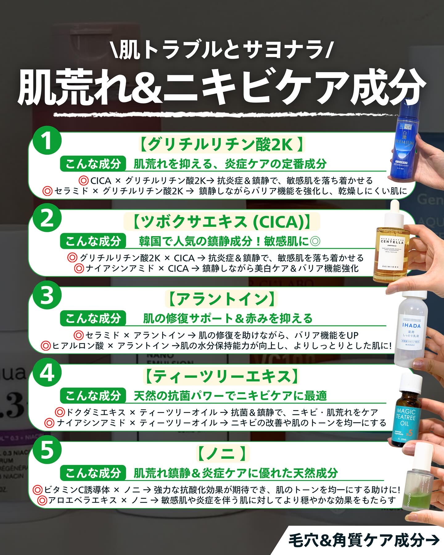 毛孔性角化症って言って、開いた毛穴に古い角質が角栓となって詰まって、その先端が突き出した状態がブツブツとなって皮膚表面に現れるの! 角栓が詰まることが原因だから、メイク汚れや皮脂をクレンジングでしっかり落として、サリチル酸などのピーリング成分で肌のターンオーバーを正常にすることが改善への第一歩! 保湿これ本当に大事で、角質層が乾燥してると肌を潤わせるために皮脂を過剰分泌しちゃうから、しっかり保湿することが大切!